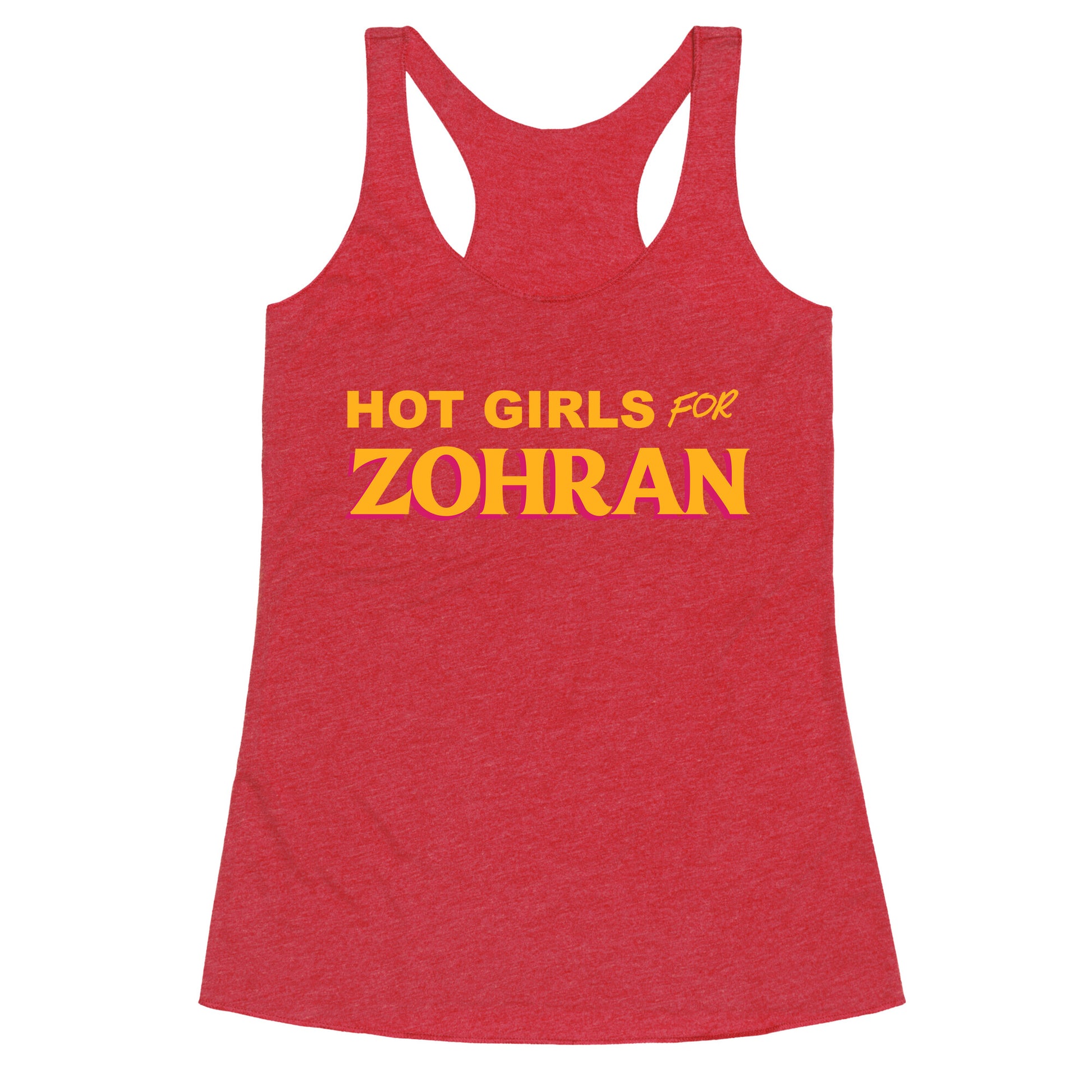 Turn heads and spark conversation with this bold "Hot Girls for Zohran" tee that celebrates confidence and charisma. Perfect for those who wear their energy and their support loud and proud. Our super comfortable Womens Raw Edge Racerback features a soft tri-blend, unhemmed fabric, with a fashionable bell-like shape for the bottom. Preshrunk for your convenience! Printed in the USA. Made with 50% Polyester 25% Ring Spun Cotton, and 25% Rayon.