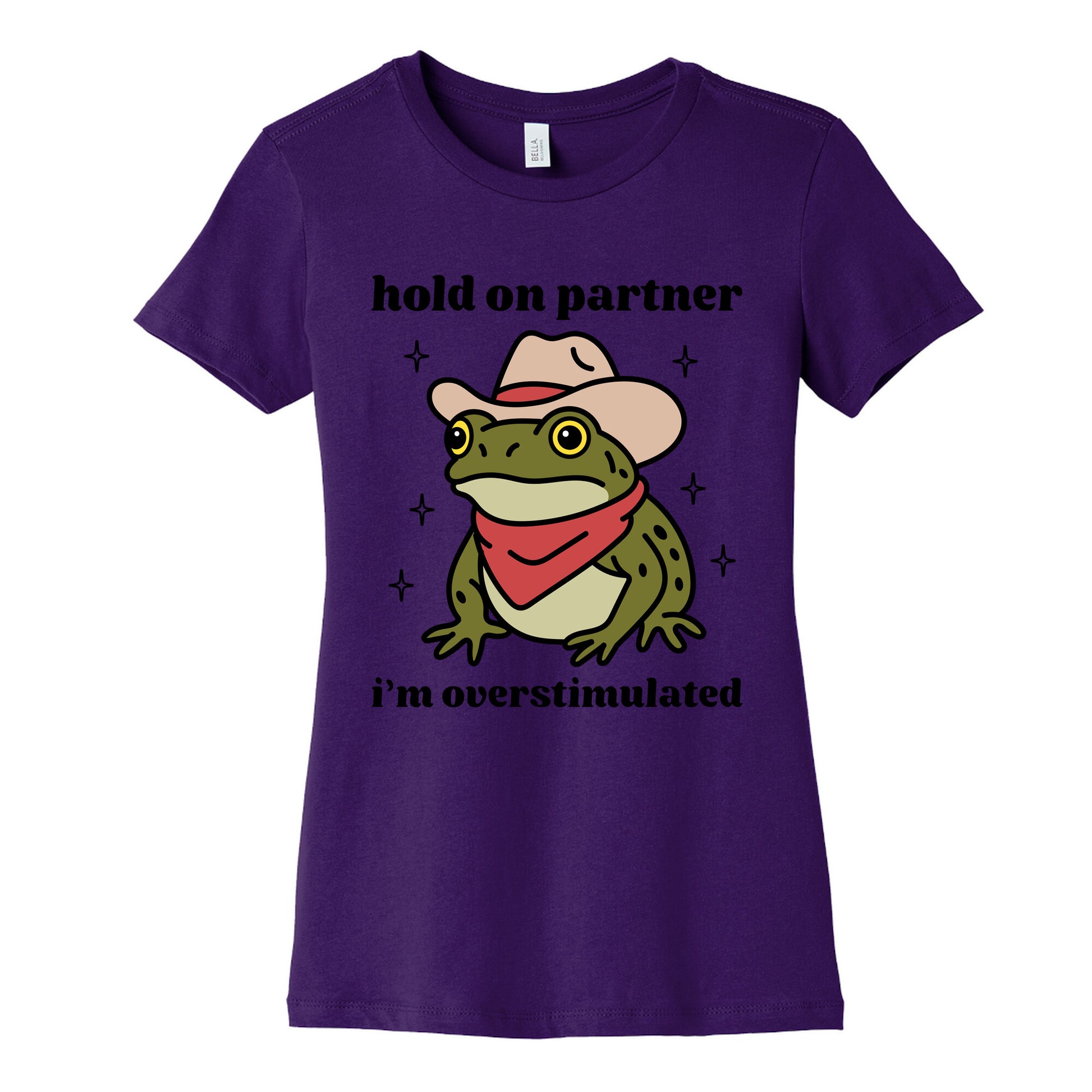 Show off your inner chaos with this "Hold on Partner, Im Overstimulated" frog shirt featuring a hilariously frazzled frog hanging on for dear life. Perfect for anyone who thrives on humor, relatability, and just a little bit of sensory overload. Our slim fit Womens Cotton Tees, are made with exceedingly soft 100% cotton. They feature a relaxed neckline, and the sleeves and bottom, are hemmed for durability. Preshrunk for your convenience! Printed in the USA. Made with 100% Cotton. Colors such as gray, is made up of 90% cotton and 10% polyester, and deep pink is made up of 50% cotton and 50% polyester.