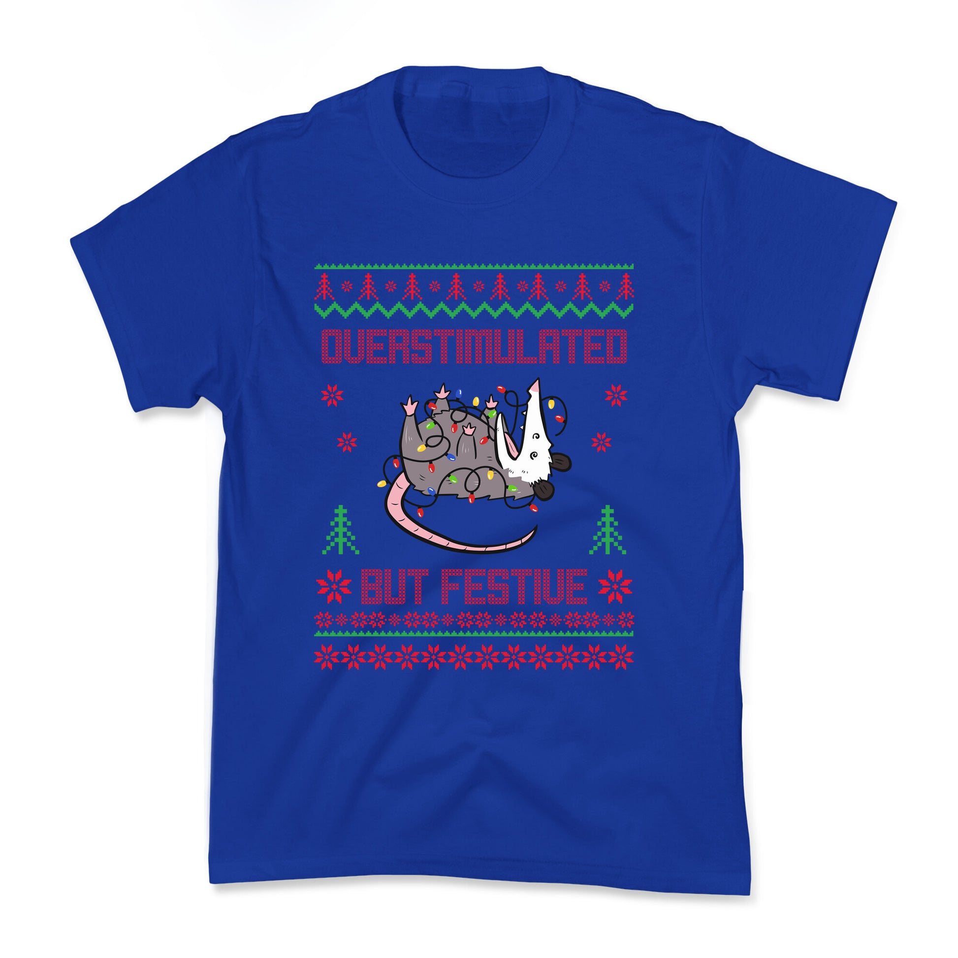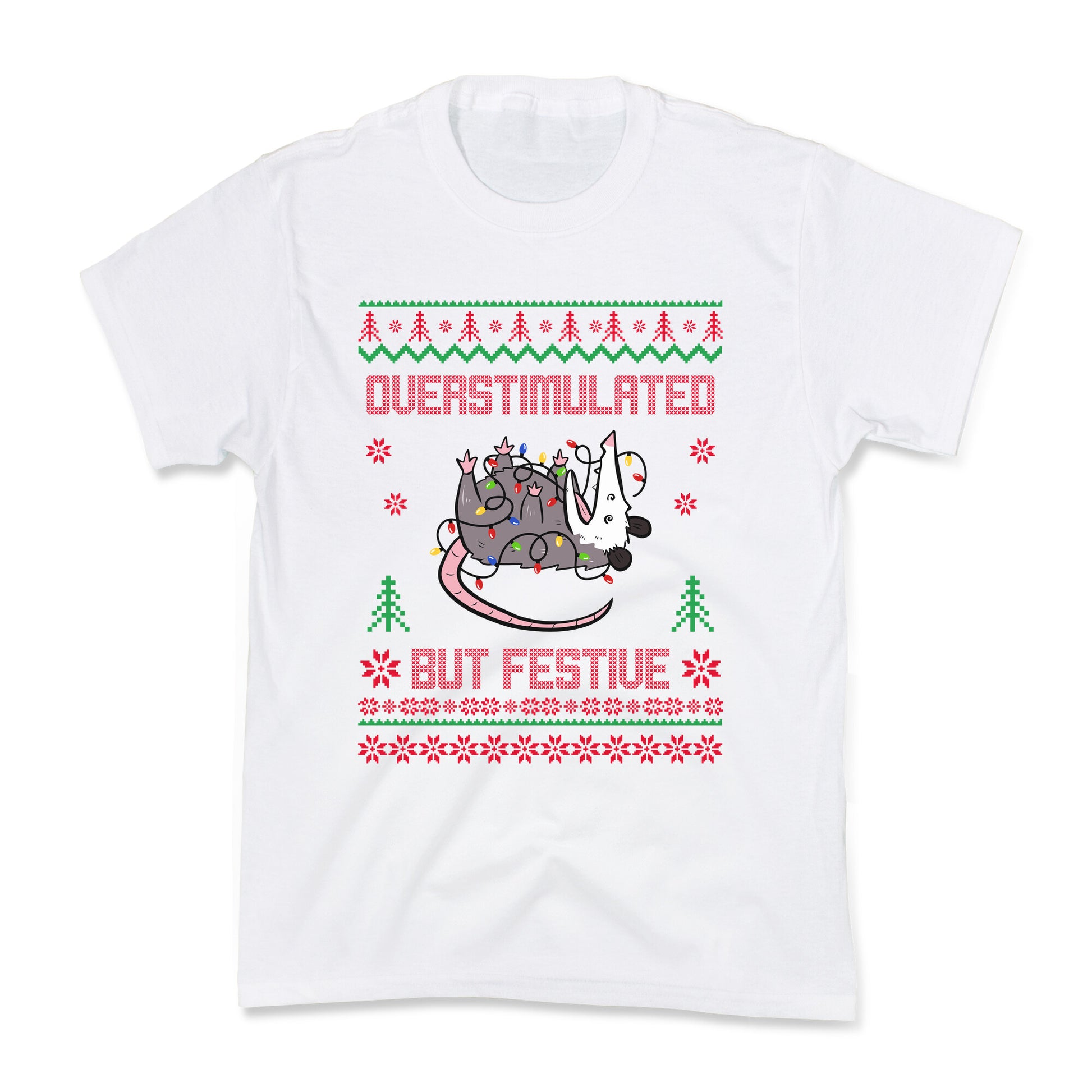 Celebrate the chaos of the holidays with our "Overstimulated but Festive" possum design  perfectly capturing that unhinged holiday spirit. Equal parts relatable and ridiculous, its the ultimate mood for anyone powering through the season with feral cheer. Our cool Kids Tees are made with exceedingly soft 100% ring spun cotton with hemmed sleeves and bottoms for durability. Preshrunk for your convenience! Printed in the USA. Made with 100% Cotton.
