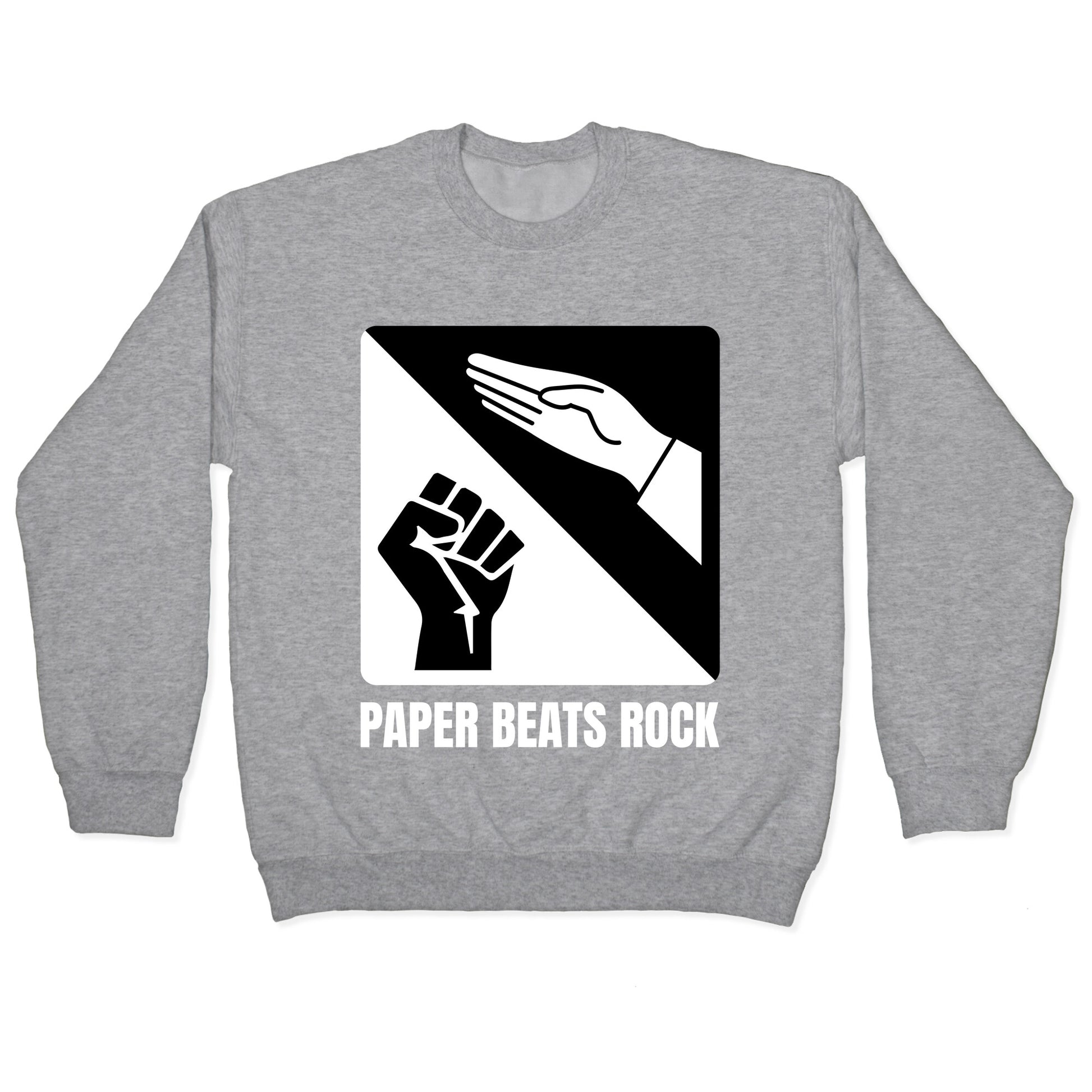 Defy the old rules with a bold twist on the classic game where ideas and rebellion always win. Paper Beats Rock isnt just a phrase, its a reminder that thought shatters power every time. Our Unisex Crewneck Sweatshirt is made from a soft 8-ounce fabric, and they feature a crew neck, with sleeve and bottom hems for durability. Great for layering. Preshrunk for your convenience! Printed in the USA. Made with 50% Cotton and 50% Polyester.