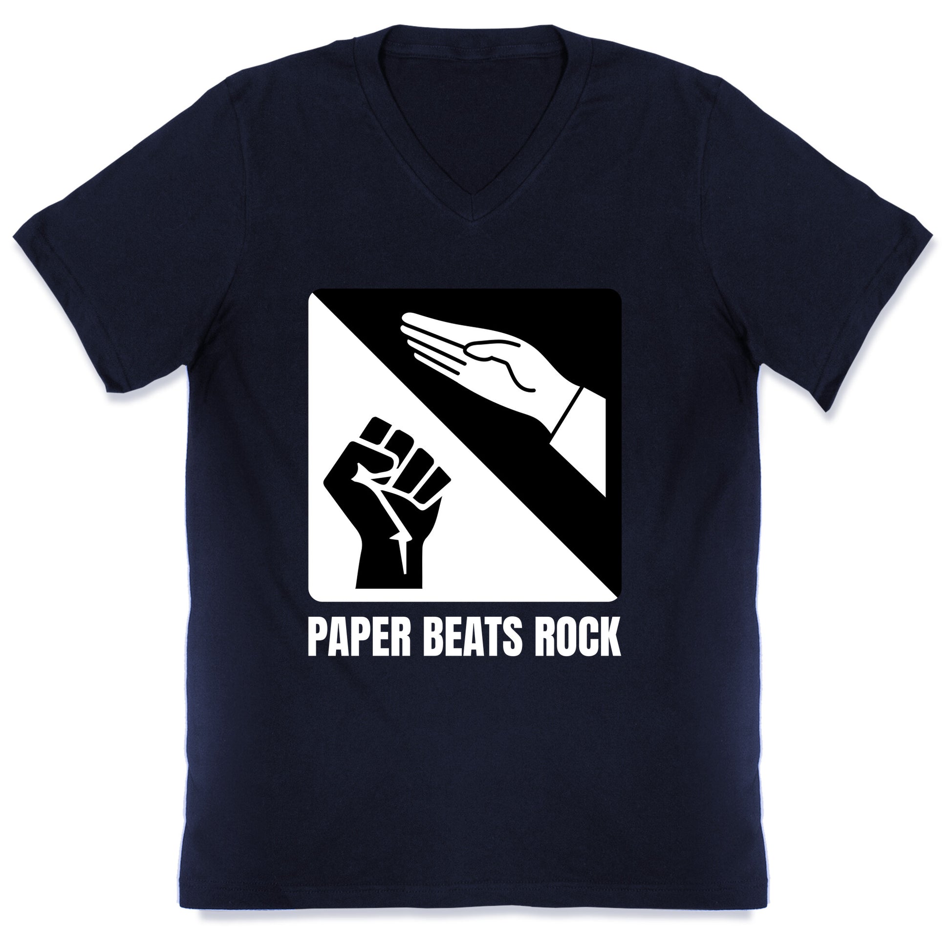 Defy the old rules with a bold twist on the classic game where ideas and rebellion always win. Paper Beats Rock isnt just a phrase, its a reminder that thought shatters power every time. Our fitted Mens V-Neck tees are made with a soft jersey fabric. They feature a v-neckline, with sleeve and bottom hems for durability. Preshrunk for your convenience! Printed in the USA. Solid colors made with 100% Cotton and otherwise 90% Cotton and 10% Polyester.