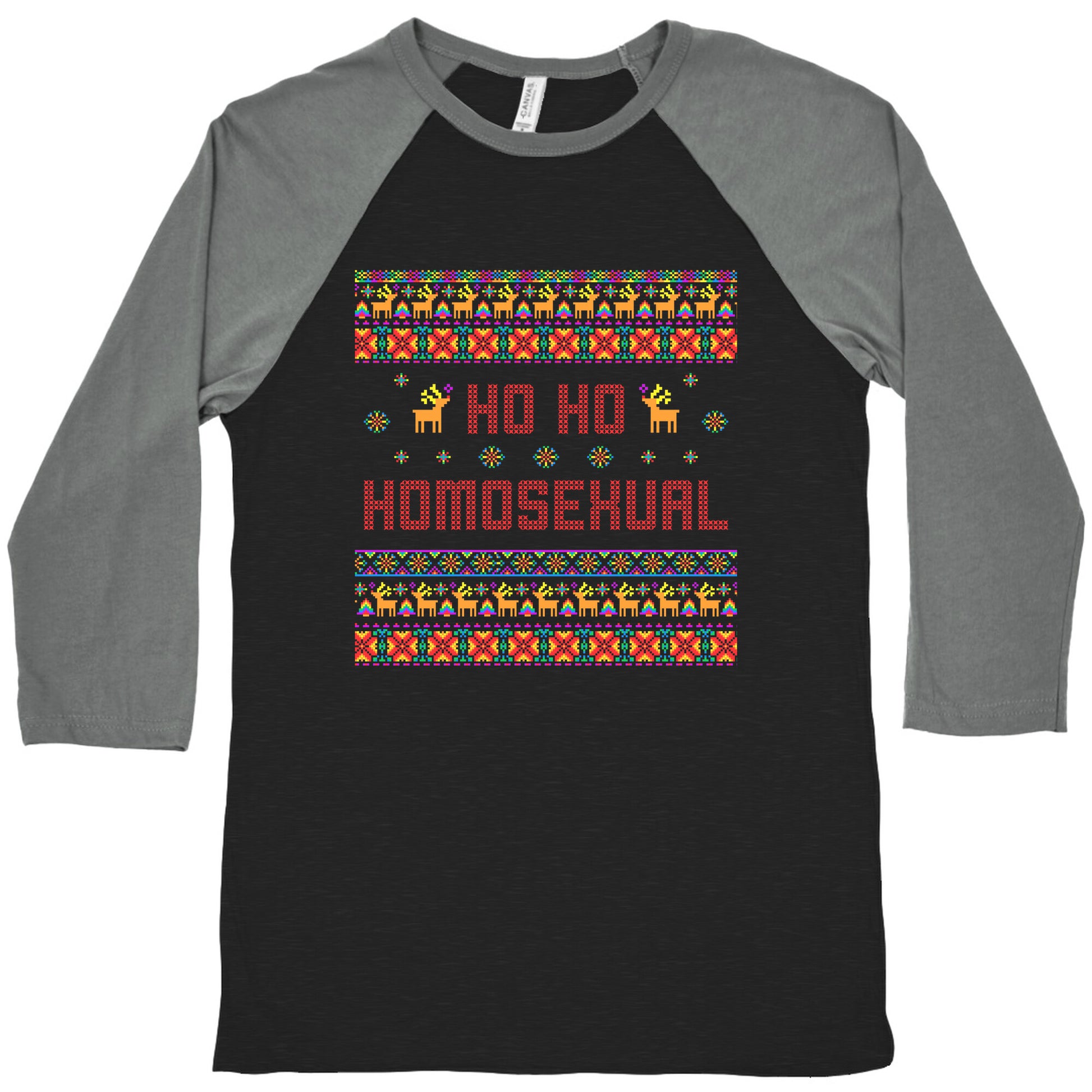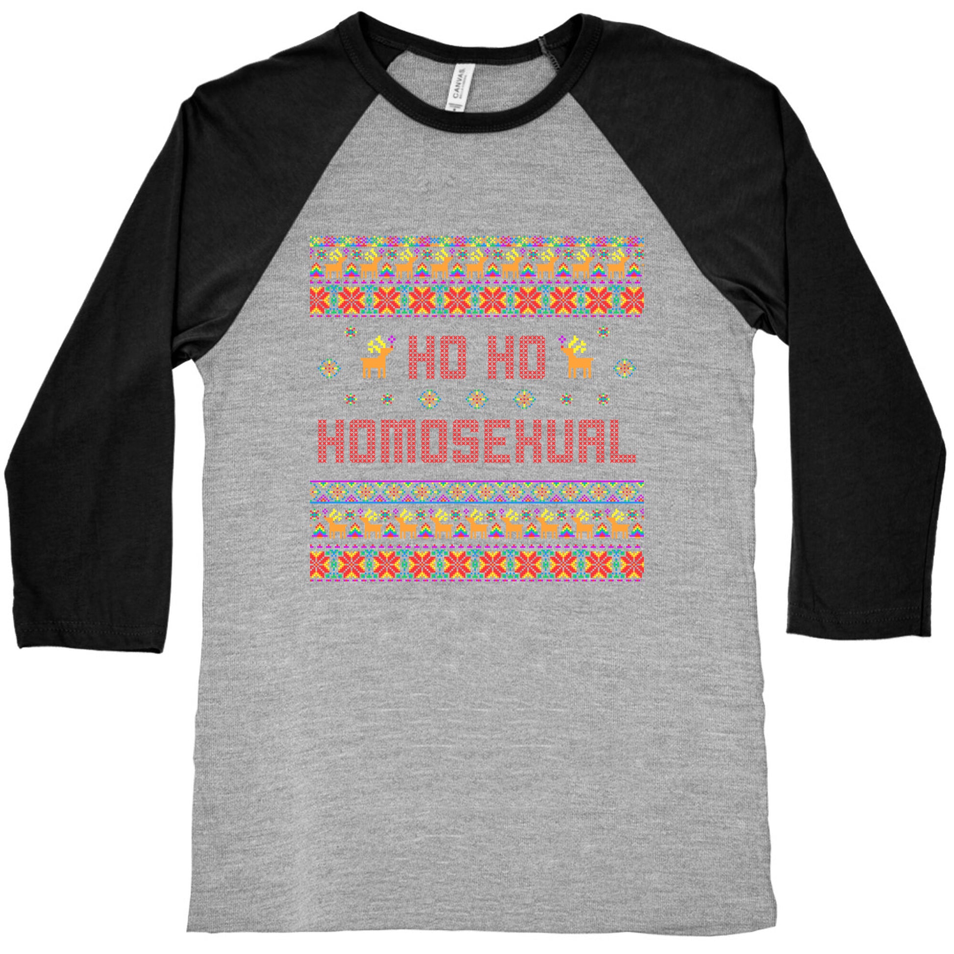 Spread festive cheer and pride with this playful "Ho Ho Ho Homosexual" holiday shirt thats sure to sleigh at every celebration. Perfect for making spirits bright and embracing your fabulous holiday spirit with a wink and a smile. Our exceedingly soft and relaxed fit Tri-Blend Baseball Tee features a three-quarter length sleeve, crew neck, fun contrasting color sleeves and neck trim. Preshrunk for your convenience! Printed in the USA. Made with 50% Polyester, 25% Cotton and 25% Rayon
