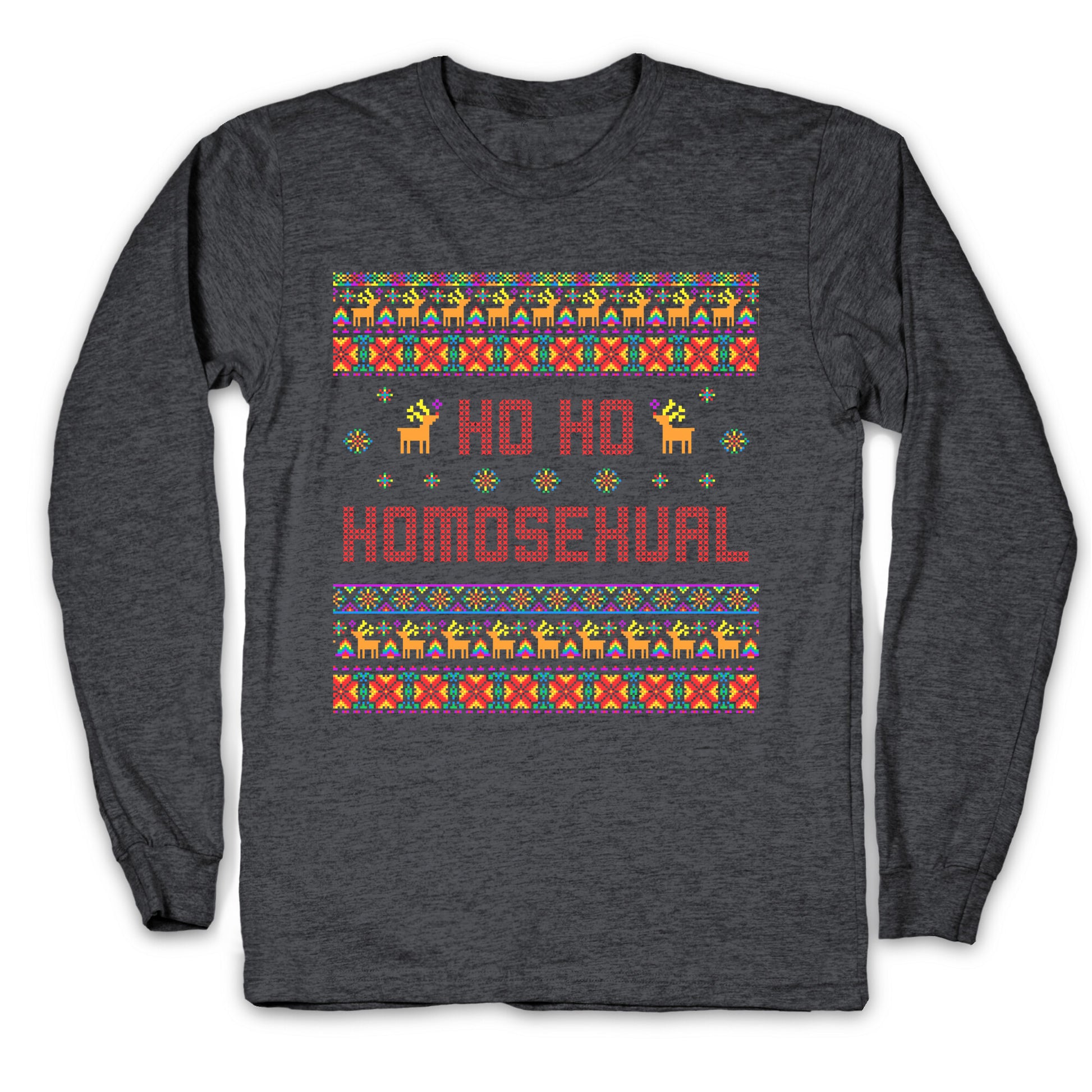 Spread festive cheer and pride with this playful "Ho Ho Ho Homosexual" holiday shirt thats sure to sleigh at every celebration. Perfect for making spirits bright and embracing your fabulous holiday spirit with a wink and a smile. Our Unisex Long Sleeve Tee is made from a soft 100% cotton jersey knit. It features a crew neckline with ribbed cuffs and hemmed bottom for durability. Preshrunk for your convenience! Printed in the USA. Athletic Gray is made up of 90% cotton and 10% polyester.