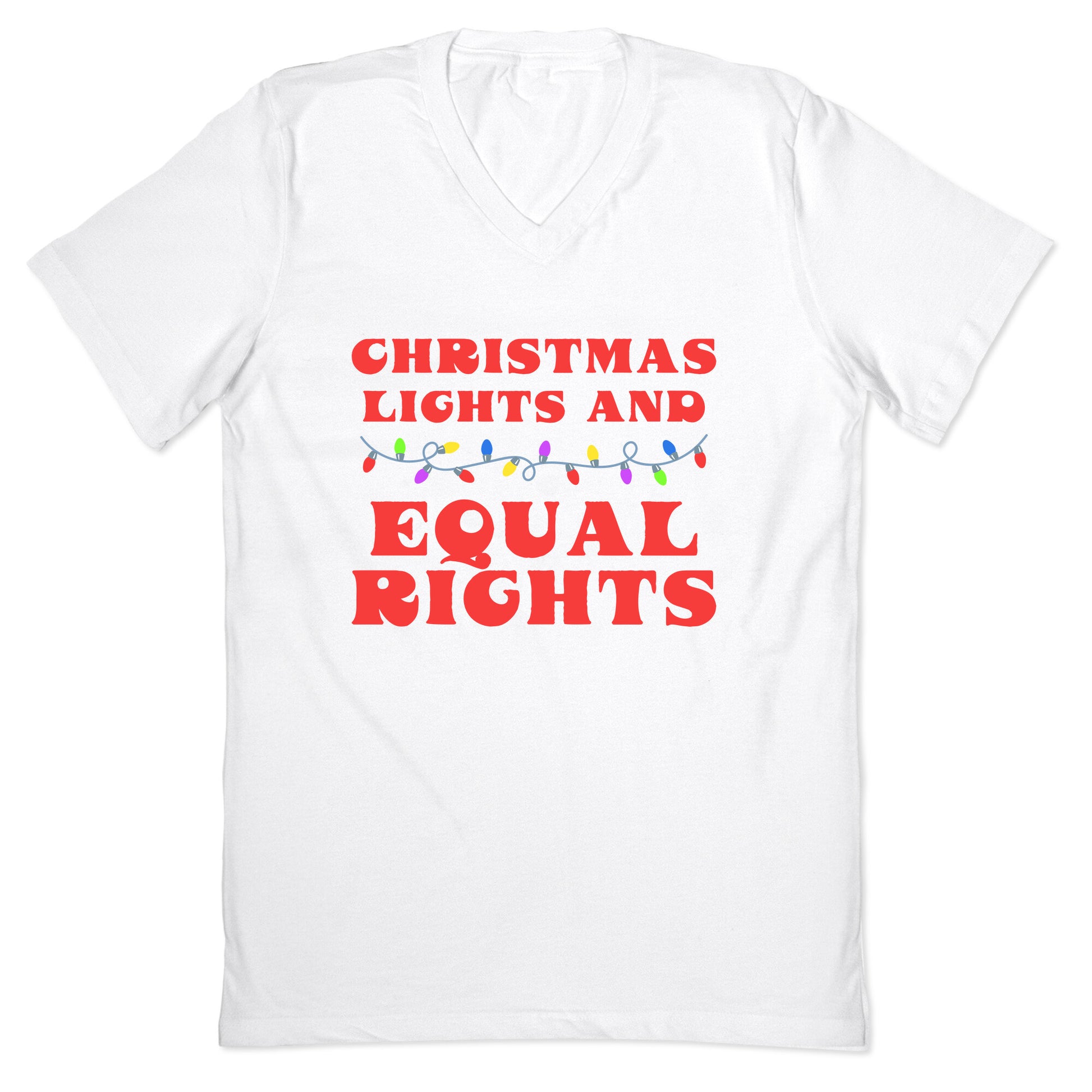 Shine bright this season with a design that celebrates Christmas lights and equal rights in perfect harmony. Spread cheer and inclusivity wherever you go with this festive statement of love and equality. Our fitted Mens V-Neck tees are made with a soft jersey fabric. They feature a v-neckline, with sleeve and bottom hems for durability. Preshrunk for your convenience! Printed in the USA. Solid colors made with 100% Cotton and otherwise 90% Cotton and 10% Polyester.