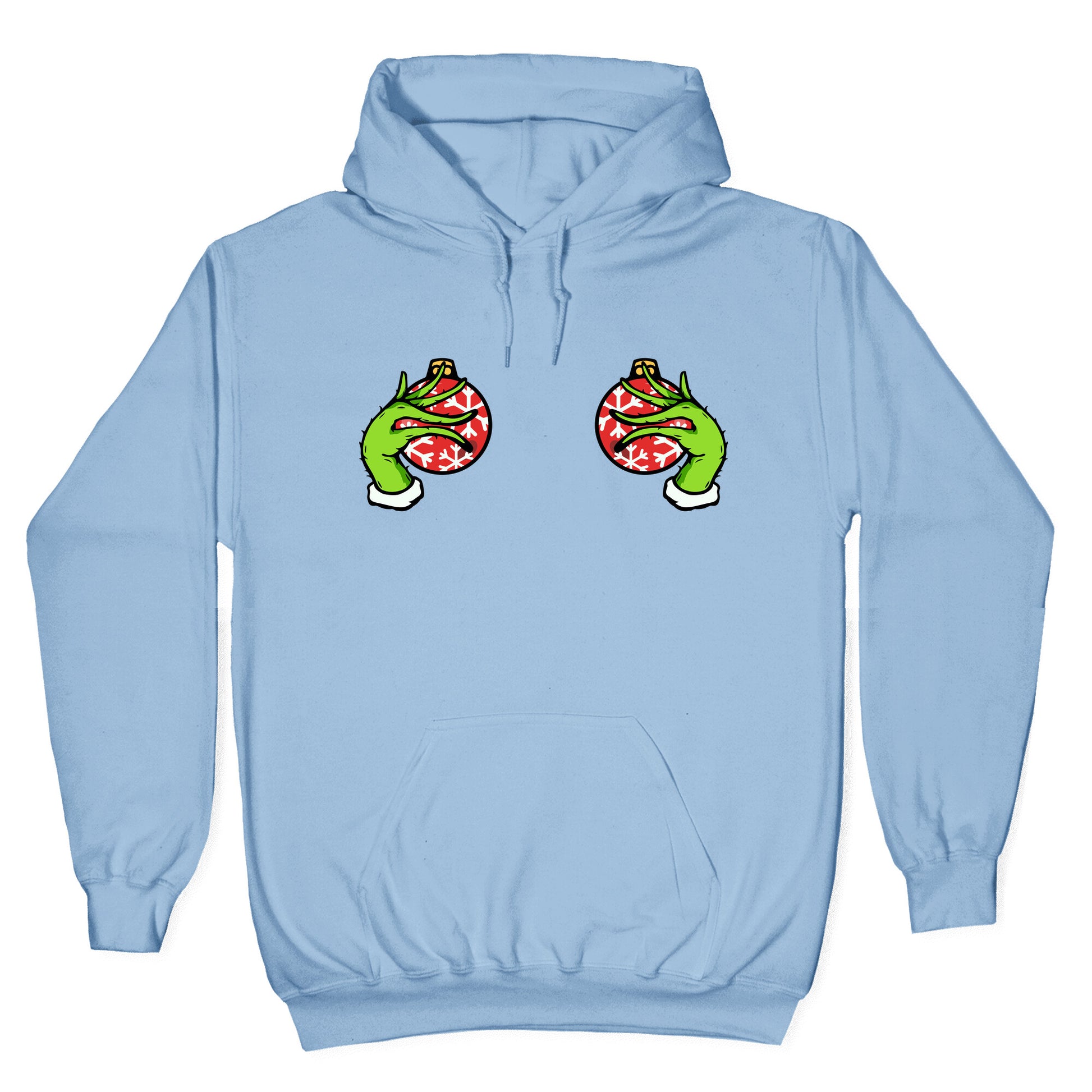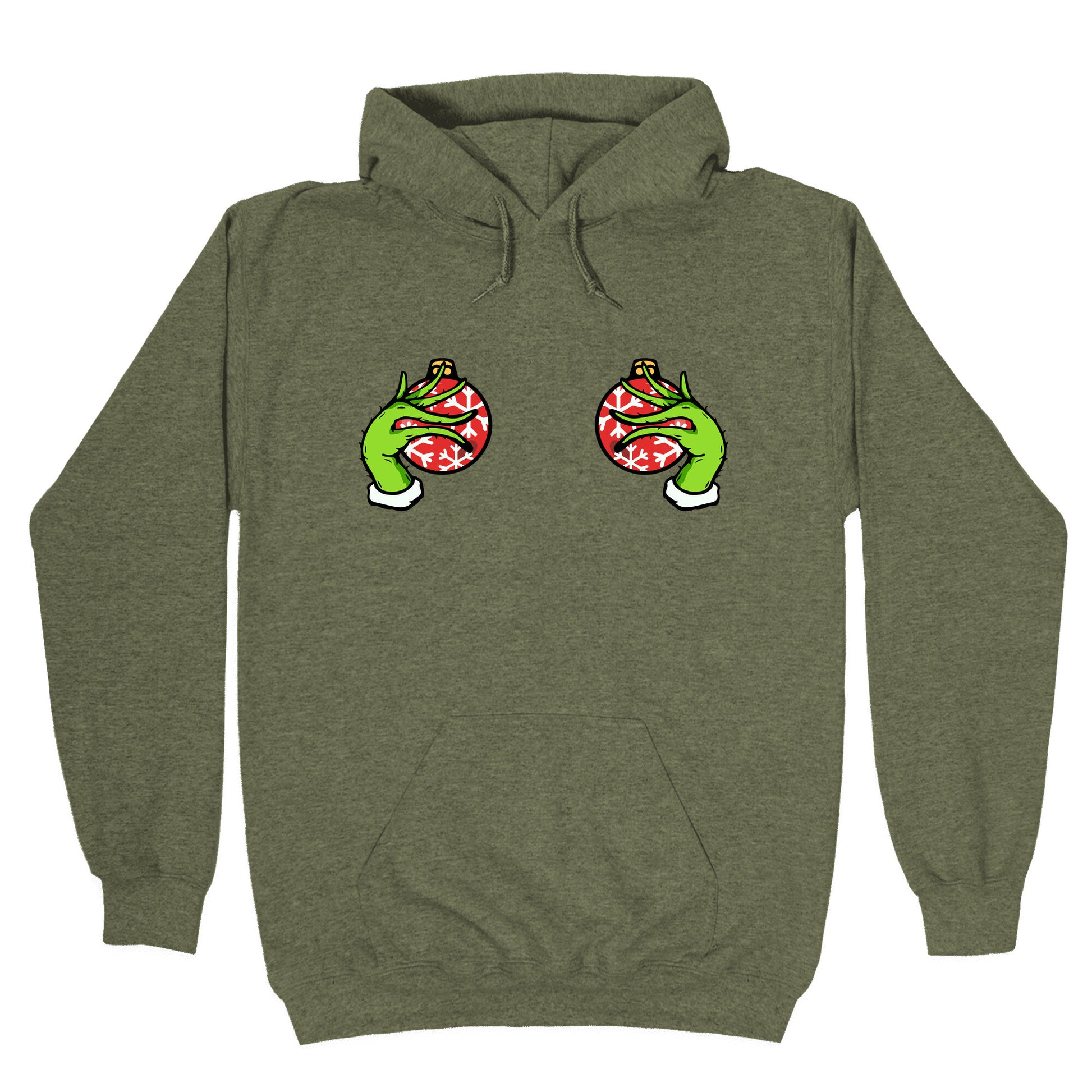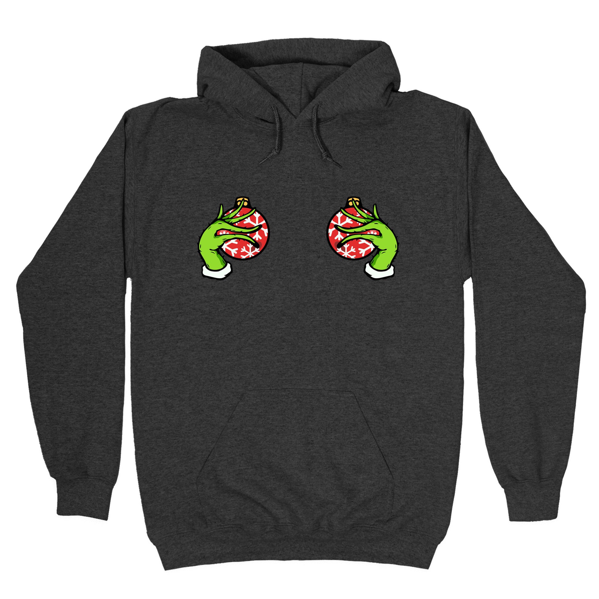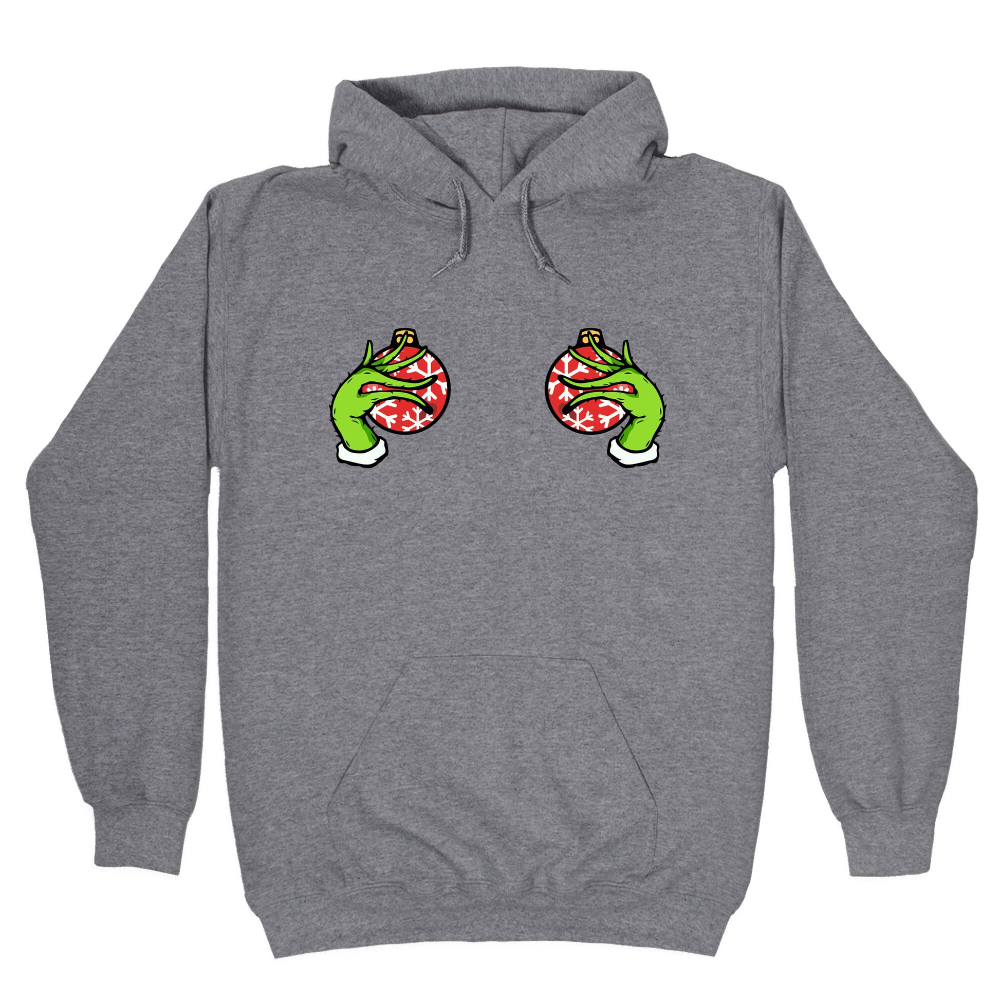 This cheeky holiday tee features mischievous Grinch hands playfully cupping festive "baubles" for a bold, tongue-in-cheek Christmas look. Perfect for anyone who loves naughty humor, its guaranteed to get laughs at holiday parties and adult gift exchanges. Our Unisex Pullover Hoodie is made from a soft 8-ounce fabric They feature a drawstring hood and front kangaroo pocket. Great for layering! Preshrunk for your convenience! Printed in the USA. Made with 50% Cotton and 50% Polyester.