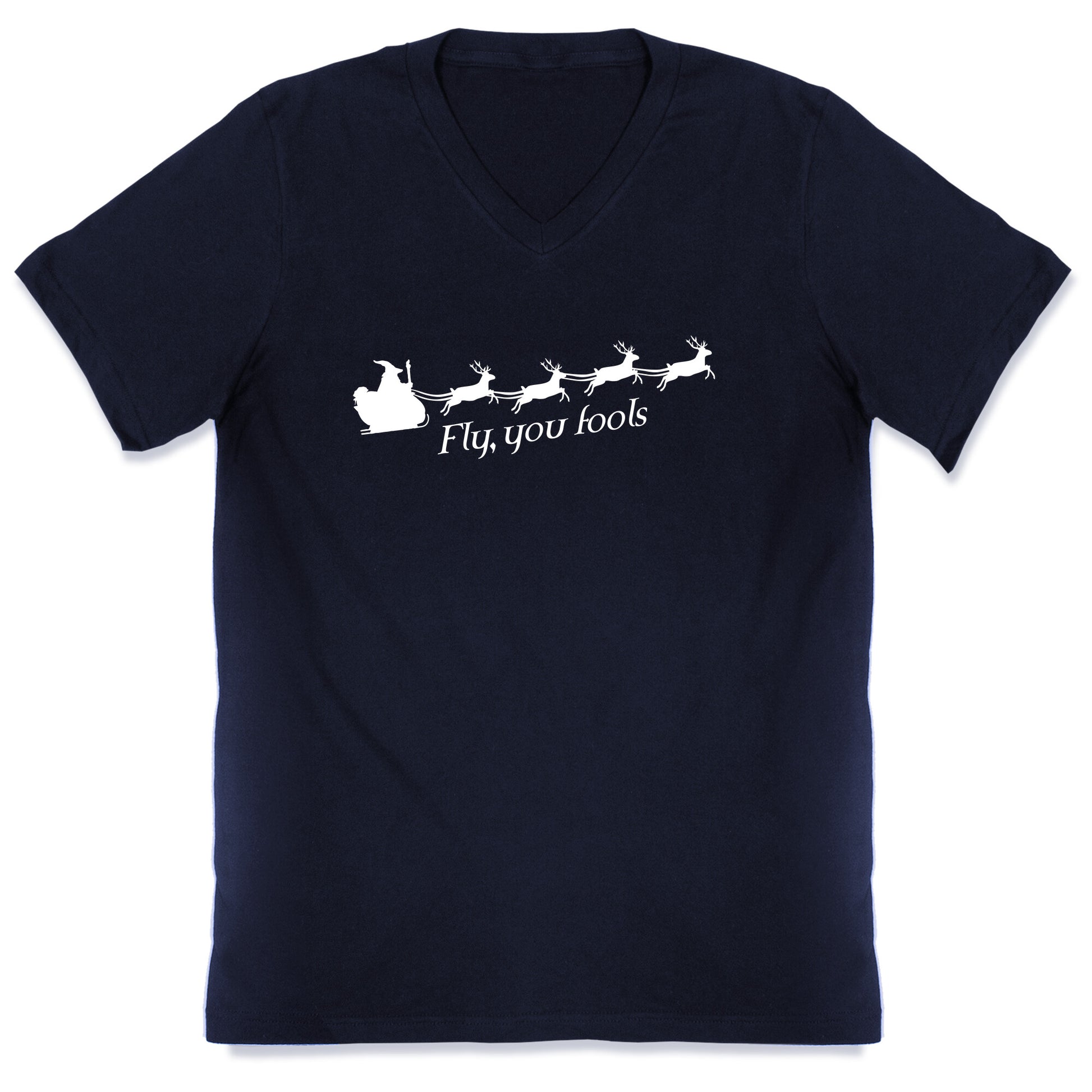 Gandalf charges across the sky on a roaring reindeer sleigh, commanding the night with epic wizard energy. "Fly you fools" blazes beneath the scene, making this shirt a perfect blend of fantasy, humor, and holiday chaos. Our fitted Mens V-Neck tees are made with a soft jersey fabric. They feature a v-neckline, with sleeve and bottom hems for durability. Preshrunk for your convenience! Printed in the USA. Solid colors made with 100% Cotton and otherwise 90% Cotton and 10% Polyester.