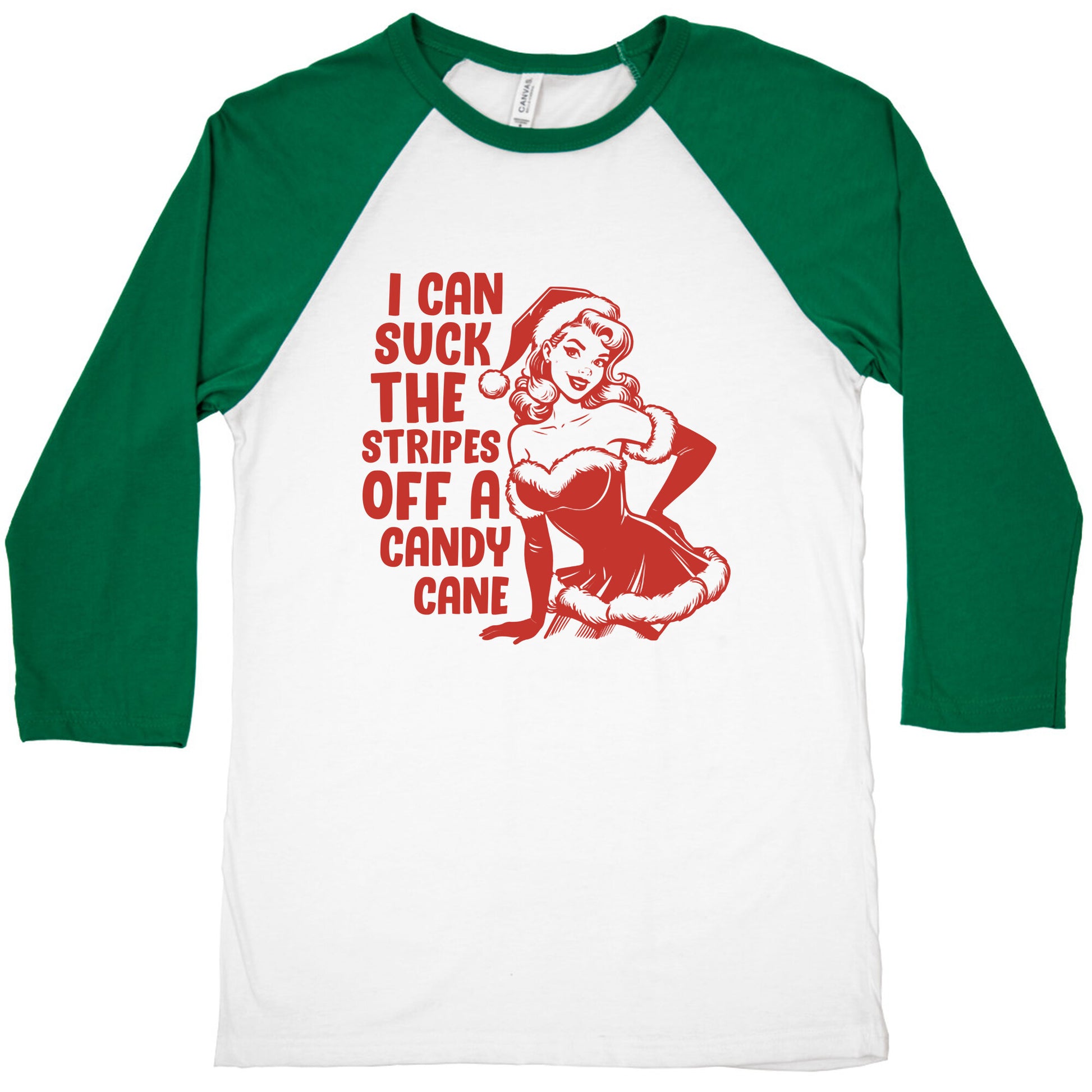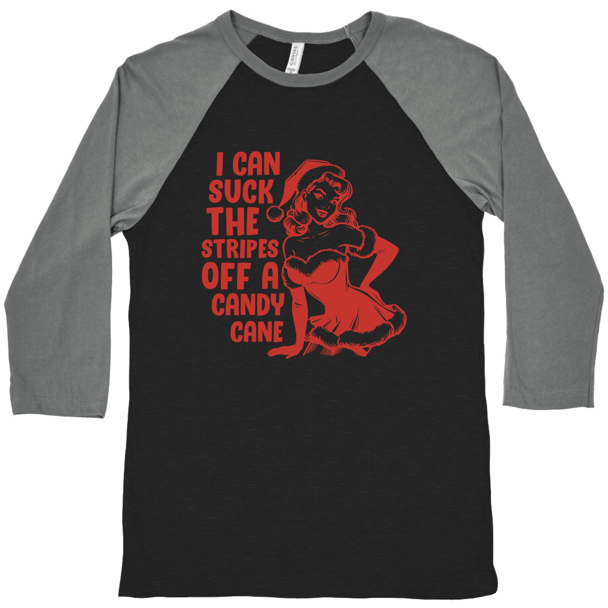 Get festive and flirty with a cheeky design that proudly declares you can "Suck the Stripes off a Candy Cane." Perfect for holiday parties where youre aiming for laughs, raised eyebrows, and a little spicy seasonal mischief. Our exceedingly soft and relaxed fit Tri-Blend Baseball Tee features a three-quarter length sleeve, crew neck, fun contrasting color sleeves and neck trim. Preshrunk for your convenience! Printed in the USA. Made with 50% Polyester, 25% Cotton and 25% Rayon