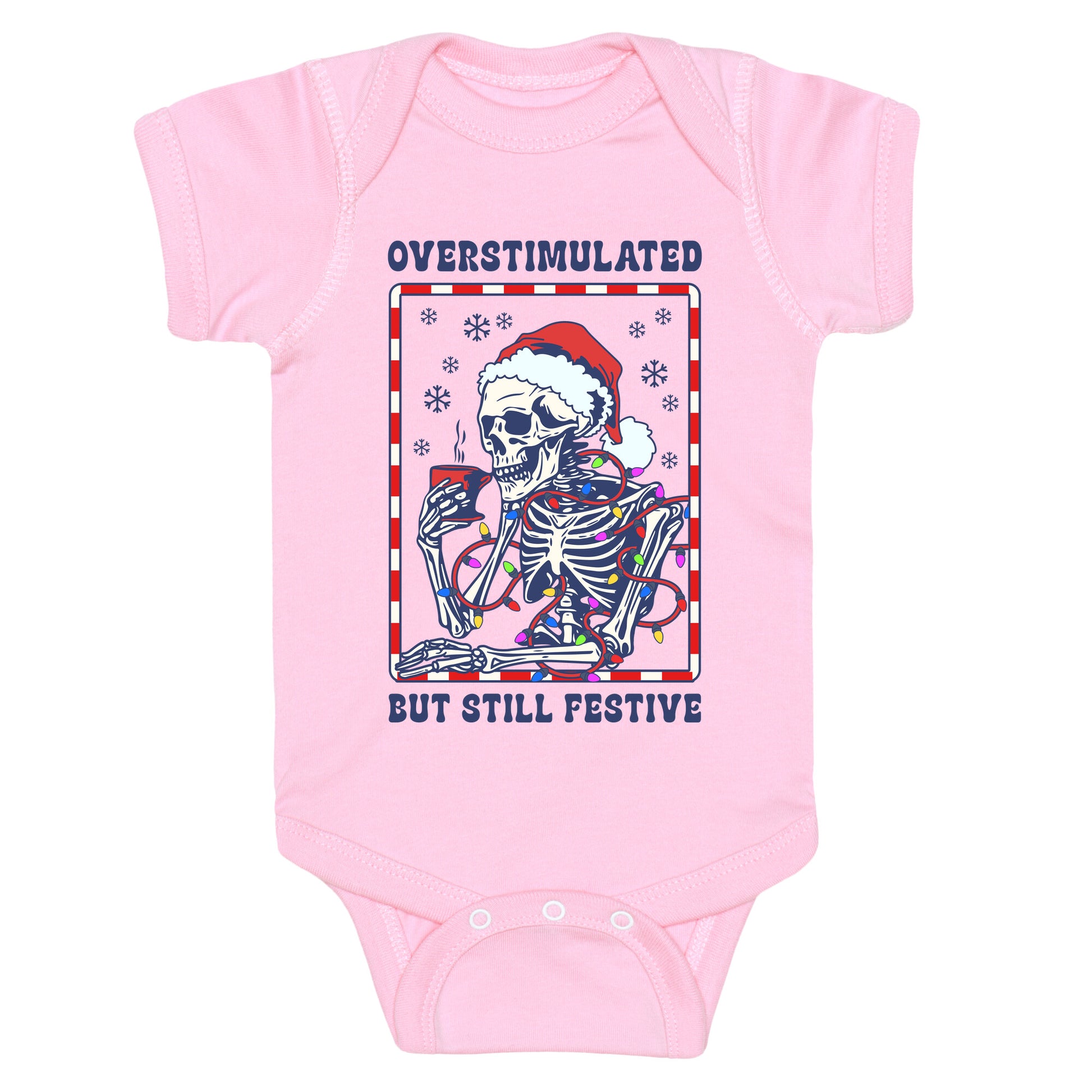 Celebrate the season with a cheeky twistthis skeleton knows the holidays can be overwhelming, but the festive spirit never dies. Perfect for anyone whos over it, yet still ready to jingle all the way. Our Baby One Piece is made from exceedingly soft 100% ring spun cotton. They are featured with hemmed seams and a reinforced 3 snap bottom closure for easy diaper changes. Preshrunk for your convenience! Printed in the USA. Made with 100% Ring Spun Cotton.