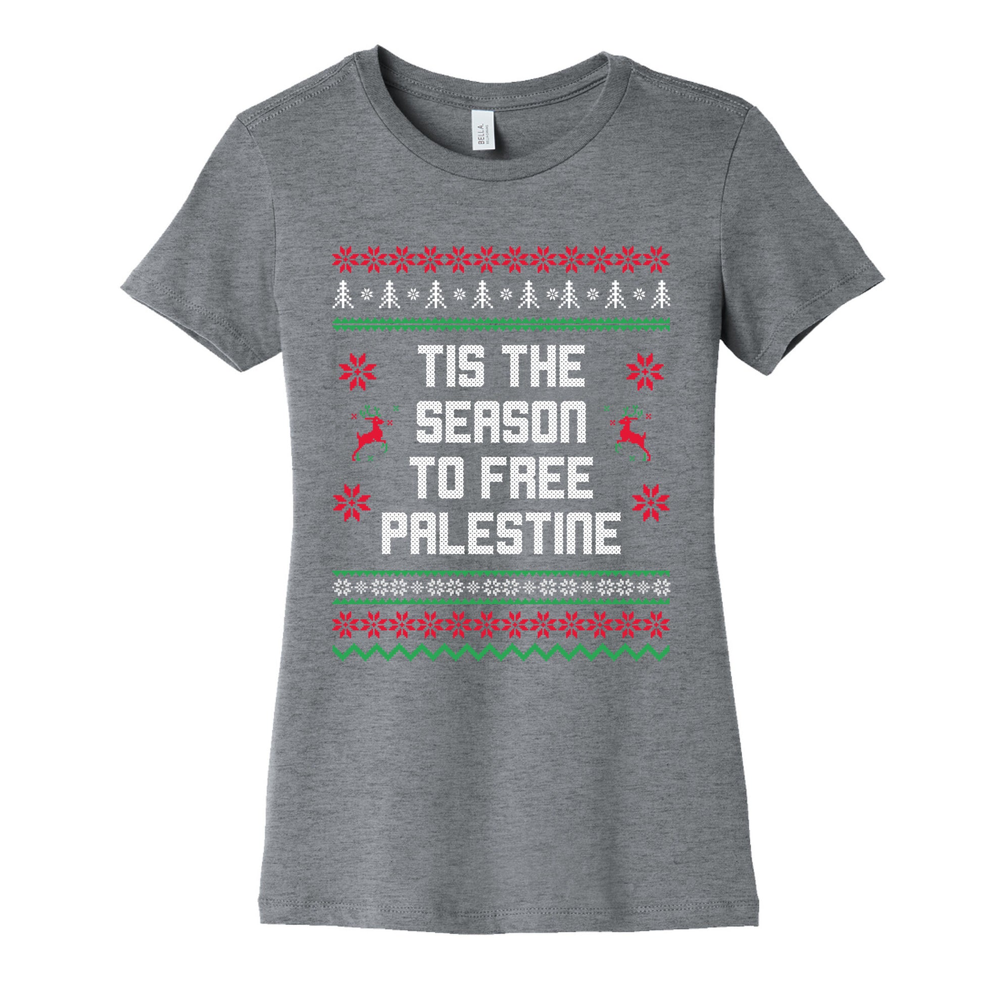 Spread a powerful message of solidarity this holiday season with our "Tis the Season to Free Palestine" shirt. Bold and meaningful, its perfect for those who want to combine festive spirit with advocacy for justice. Our slim fit Womens Cotton Tees, are made with exceedingly soft 100% cotton. They feature a relaxed neckline, and the sleeves and bottom, are hemmed for durability. Preshrunk for your convenience! Printed in the USA. Made with 100% Cotton. Colors such as gray, is made up of 90% cotton and 10% polyester, and deep pink is made up of 50% cotton and 50% polyester.