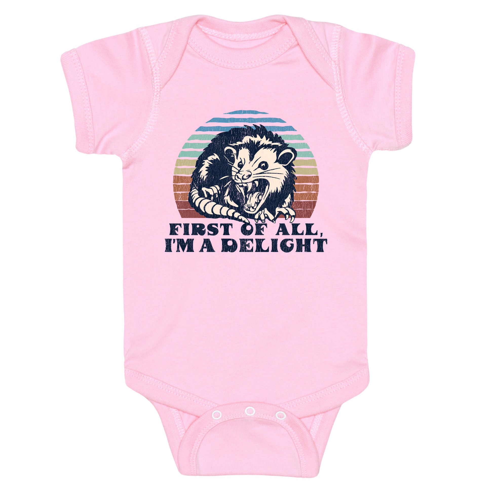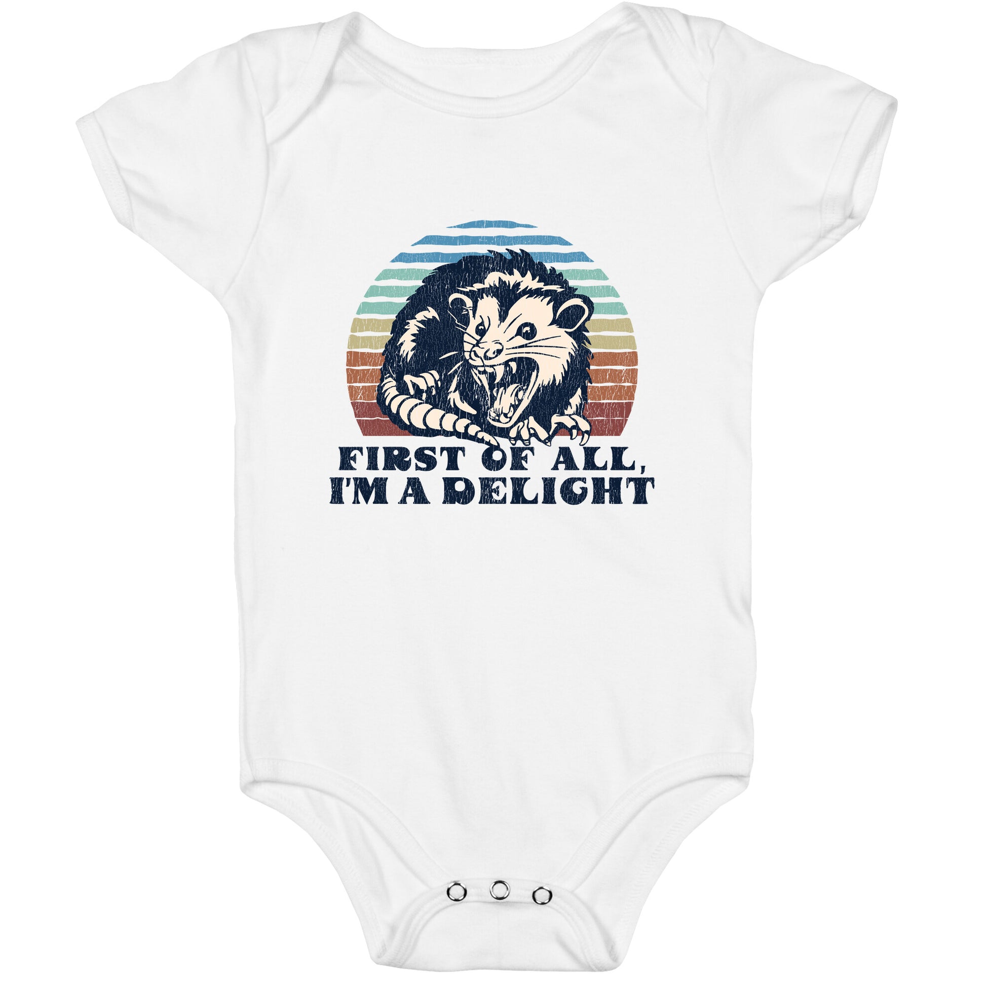 This shirt showcases a wild-eyed, unhinged possum proudly declaring, "first of all, Im a delight," turning chaotic charm into a badge of honor. Perfect for anyone whose vibe is equal parts feral energy and irresistible personality. Our Baby One Piece is made from exceedingly soft 100% ring spun cotton. They are featured with hemmed seams and a reinforced 3 snap bottom closure for easy diaper changes. Preshrunk for your convenience! Printed in the USA. Made with 100% Ring Spun Cotton.