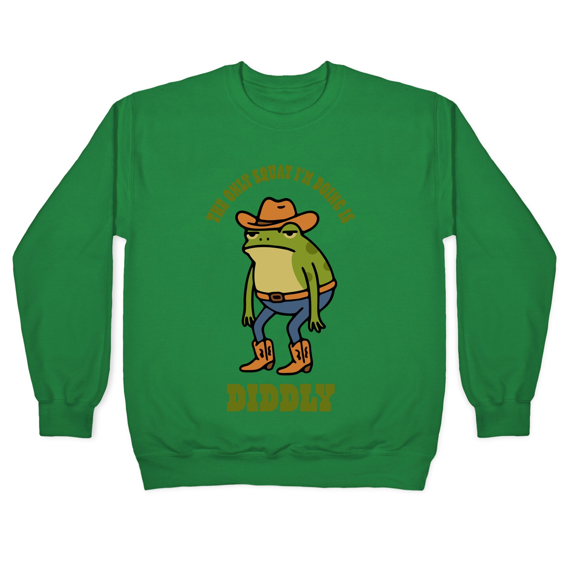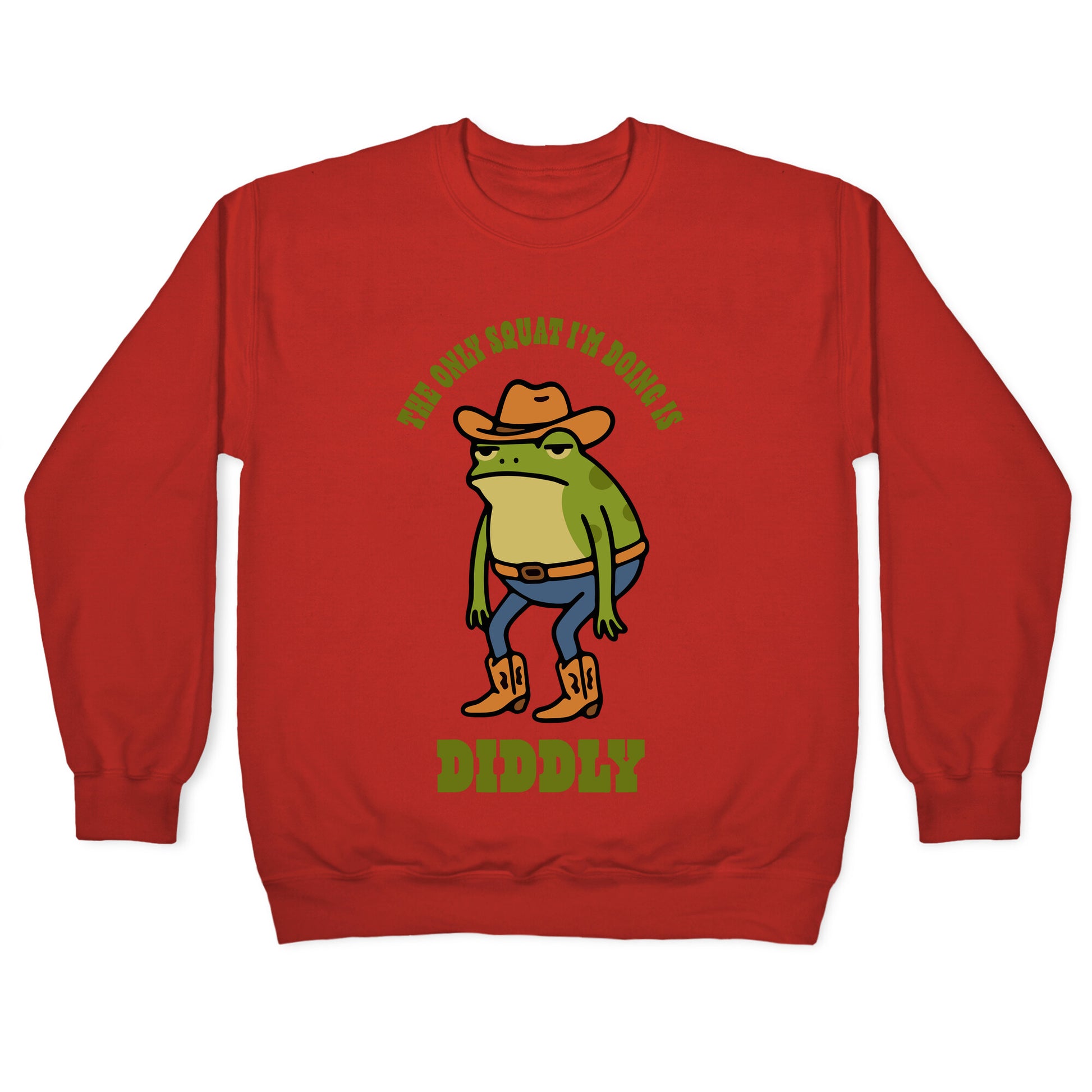 This frog has officially skipped leg day and isnt apologizing for it. Perfect for anyone whose idea of squats is exactly diddly and whose vibe is unapologetically unbothered Our Unisex Crewneck Sweatshirt is made from a soft 8-ounce fabric, and they feature a crew neck, with sleeve and bottom hems for durability. Great for layering. Preshrunk for your convenience! Printed in the USA. Made with 50% Cotton and 50% Polyester.