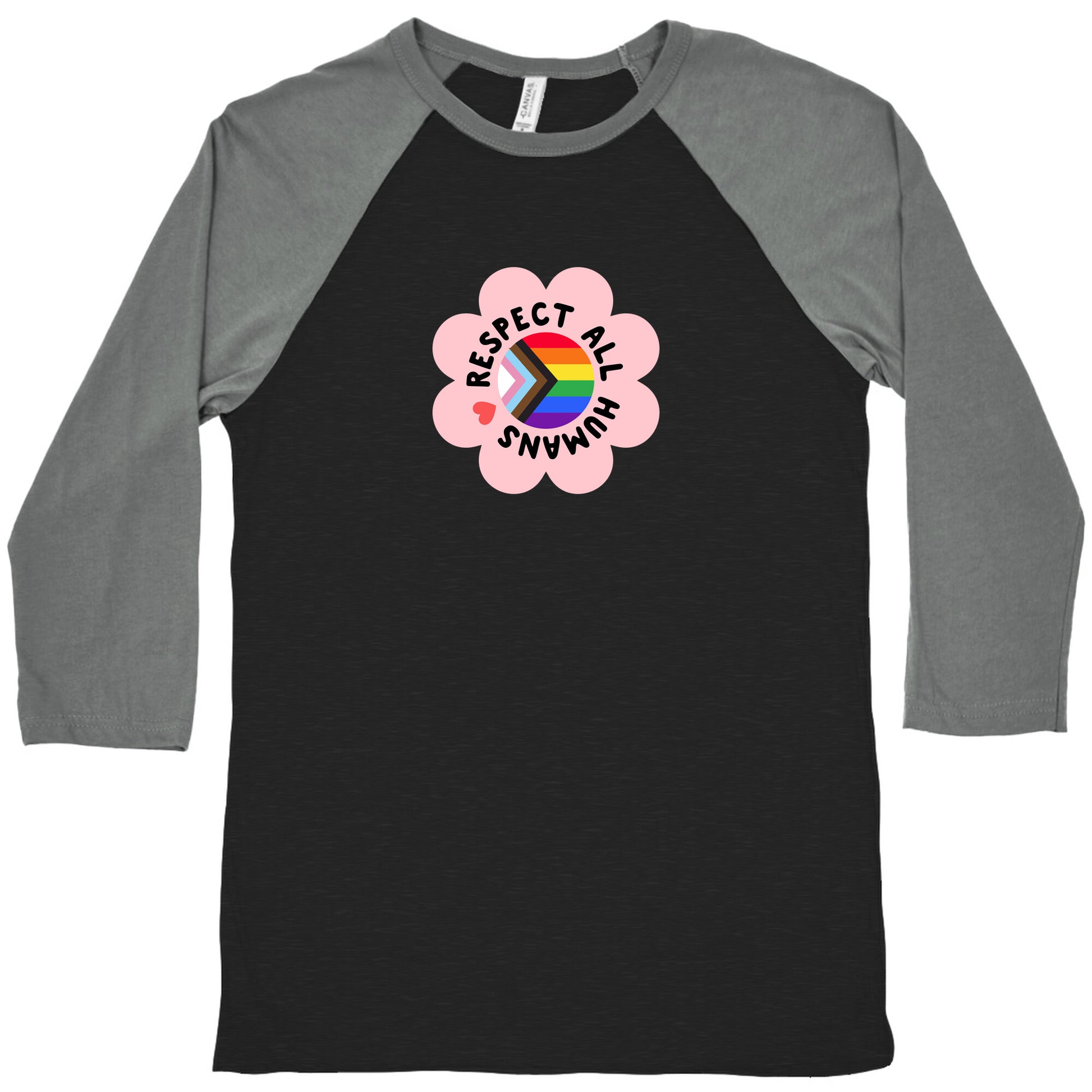 Celebrate love and equality with this empowering "Respect All Humans" shirt, a bold statement for inclusivity and acceptance. Perfect for showing pride and standing up for the LGBTQ+ community wherever you go. Our exceedingly soft and relaxed fit Tri-Blend Baseball Tee features a three-quarter length sleeve, crew neck, fun contrasting color sleeves and neck trim. Preshrunk for your convenience! Printed in the USA. Made with 50% Polyester, 25% Cotton and 25% Rayon