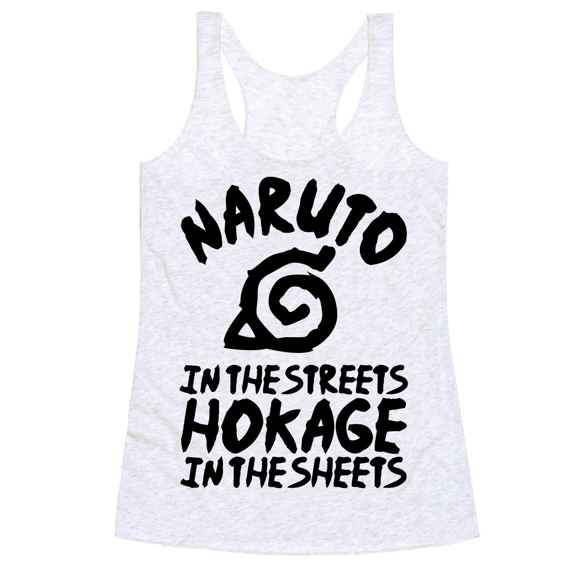 Got mad skills in the art of ninja seduction? Show your love of anime as well as your sexual prowess with this design that features the phrase "Naruto in the streets, Hokage in the sheets."Our super comfortable Women’s Raw Edge Racerback features a soft tri-blend, unhemmed fabric, with a fashionable bell-like shape for the bottom. Preshrunk for your convenience! Printed in the USA. Made with 50% Polyester 25% Ring Spun Cotton, and 25% Rayon.