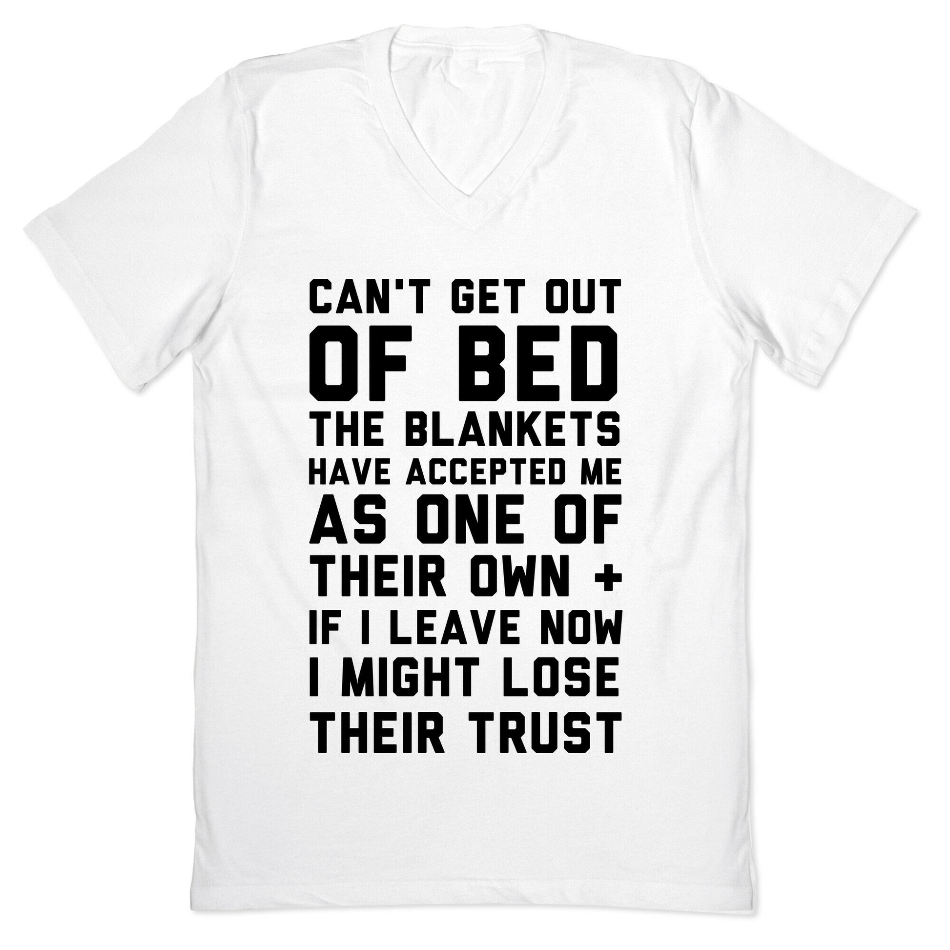 Can't get out of bed. Sorry. The blankets have accepted me as one of their own and if I leave now I might lose their trust. And then what, they might never allow me back into their snuggly cocoon of warm sleepytime happiness again. Our fitted Men's V-Neck tees are made with a soft jersey fabric. They feature a v-neckline, with sleeve and bottom hems for durability. Preshrunk for your convenience! Printed in the USA. Solid colors made with 100% Cotton and otherwise 90% Cotton and 10% Polyester.