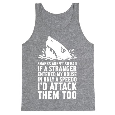 Whats with all the shark hate? I mean, C'mon, if a stranger entered my house in only a speedo I'd attack them too! Defend the majestic protector of the deep with this funny design perfect for swimming in the ocean on a sunny, summer day at the beach, a marine biologist, an animal rights activist, an environmentalist, or people who just love sharks!Our relaxed Unisex tanks, are made with exceedingly soft 100% ring spun cotton. They feature a rounded and hemmed neckline with wide comfortable straps. Preshrunk for your convenience! Printed in the USA. Made with 100% Ring Spun Cotton. Colors such as pink, grey, and blue are made with 50% poly 25% ring spun cotton and 25% Rayon.