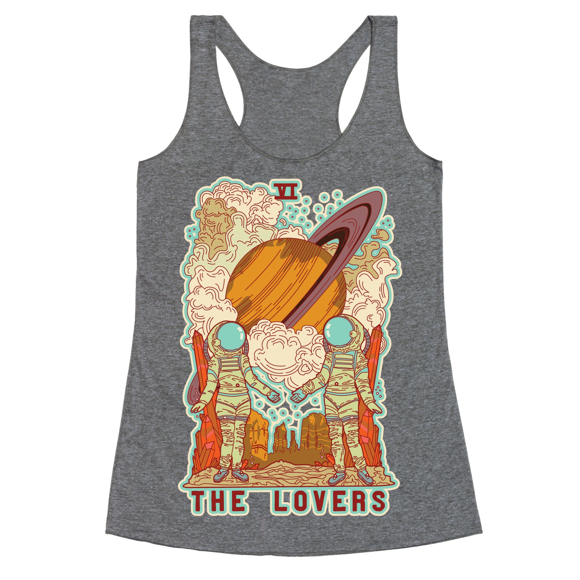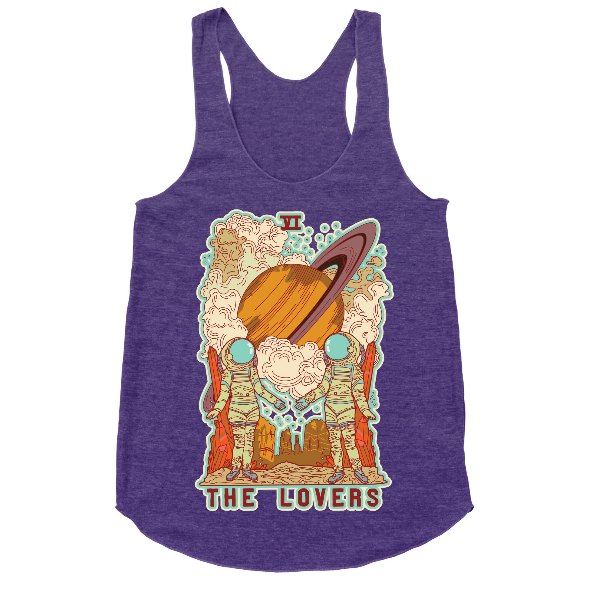 This design is a reimagining of the Lovers tarot card. The Lovers is the six card in the Major Arcana and represents relationships and choices. In this illustration we find the lovers far out on a distant planet wearing space suits as they reach for one another standing in front of giant crystals. In the distance a planet resembling Saturn plummets towards the Lovers. The god Saturn, or Cronus was the God of time. This artwork is representative of love overcoming both space and time.Our super comfortable Women’s Raw Edge Racerback features a soft tri-blend, unhemmed fabric, with a fashionable bell-like shape for the bottom. Preshrunk for your convenience! Printed in the USA. Made with 50% Polyester 25% Ring Spun Cotton, and 25% Rayon.