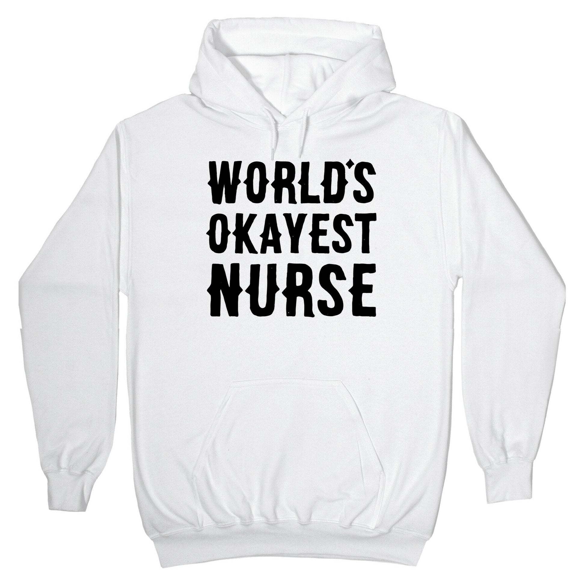 You may not be the worlds best nurse but you're also not the worlds worst nurse. Congrats on being the world okayest nurse! This design makes a perfect gift for your mother, sister, girlfriend or anyone in the nursing profession. Our Unisex Pullover Hoodie is made from a soft 8-ounce fabric They feature a drawstring hood and front kangaroo pocket. Great for layering! Preshrunk for your convenience! Printed in the USA. Made with 50% Cotton and 50% Polyester.