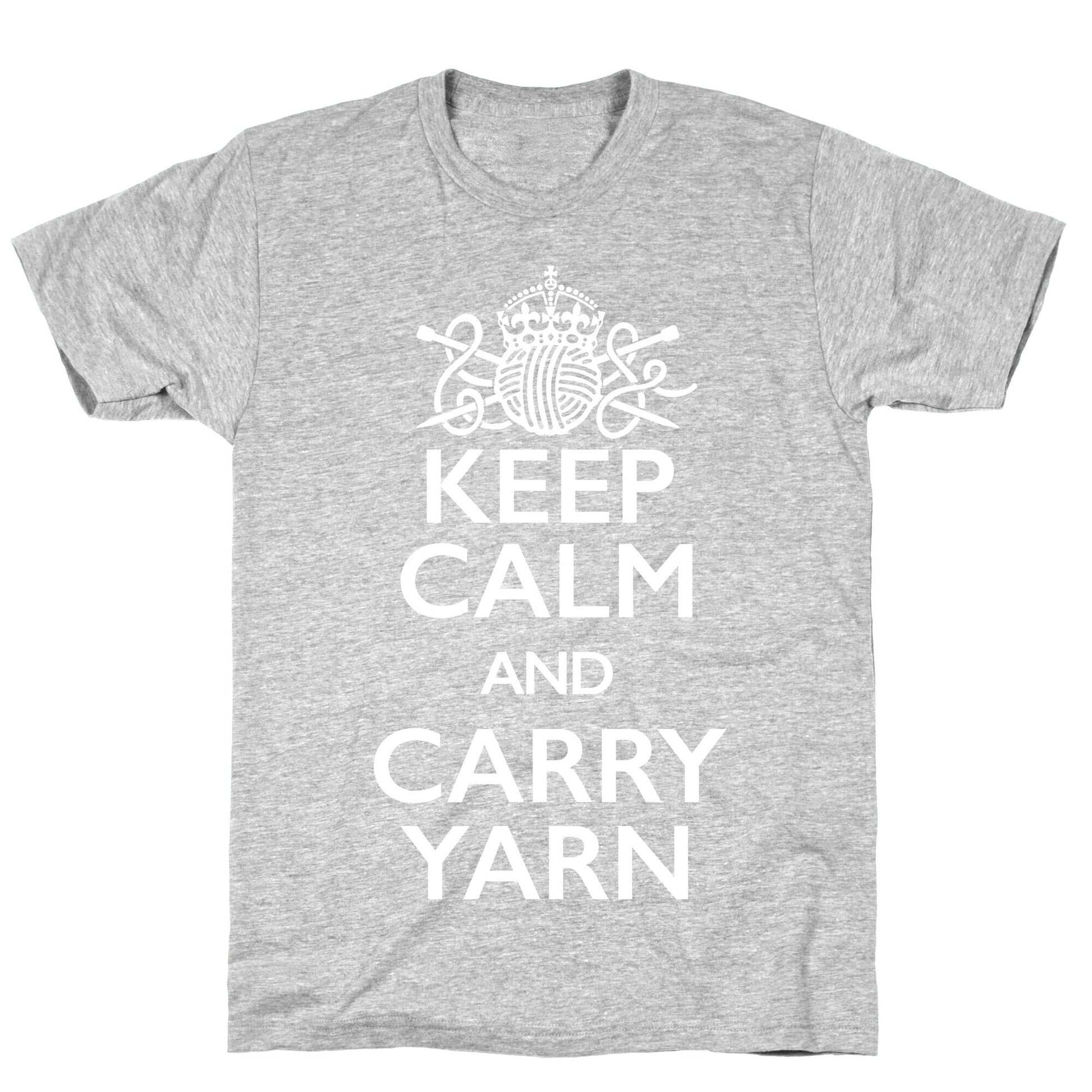 There's no better way to take some time for yourself and keep calm and meditative than with some knitting! And as long as you never run out of yarn, you'll never run out of projects to work on to keep your cool. So show off your knitting shirt pride with this cute take on the classic keep calm and carry on phrase that says keep calm and carry yarn! Our fitted Unisex Cotton tee is made from an exceedingly soft 100% ring spun cotton. It features a crew neckline with hemmed sleeves and bottom for durability. Preshrunk for your convenience! Printed in the USA. Made with 100% Ring Spun Cotton. Athletic Gray is made up of 90% cotton and 10% polyester. Other heathered colors are made of 52% cotton and 48% polyester.