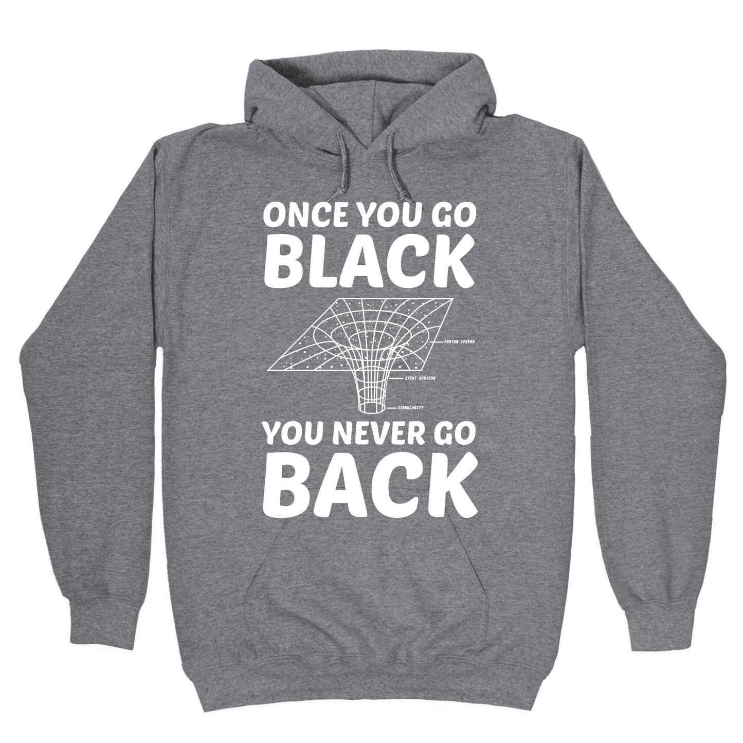 Get a kick out of your nerd friends with this physics of a black hole design. This space themed design features an illustration of black hole with the photon sphere, event horizon and point of singularity labeled and the phrase "Once you go black you never go back." Our Unisex Pullover Hoodie is made from a soft 8-ounce fabric They feature a drawstring hood and front kangaroo pocket. Great for layering! Preshrunk for your convenience! Printed in the USA. Made with 50% Cotton and 50% Polyester.