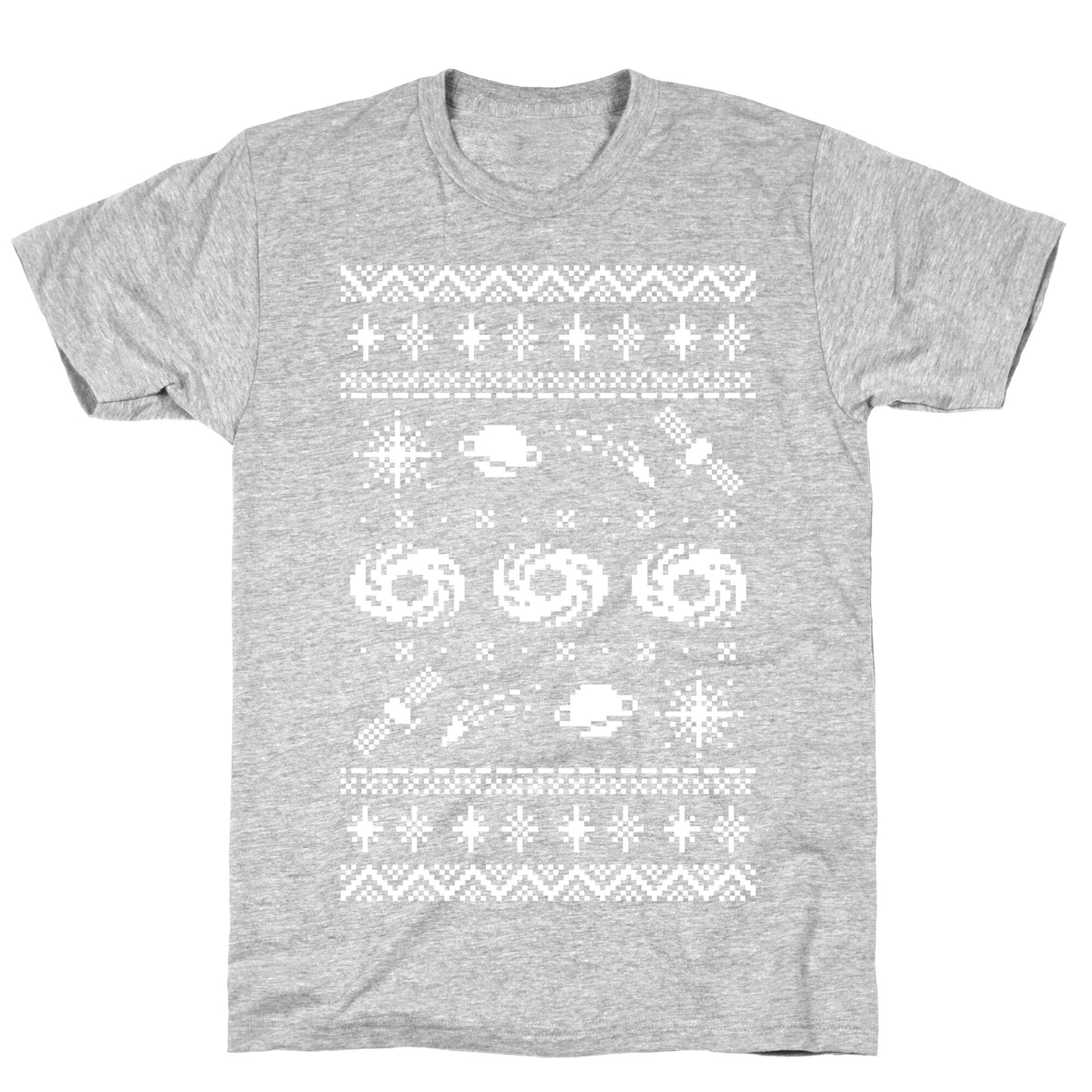 Be prepared for that ugly Christmas sweater party with this winter space pattern perfect for astronomy fans, space lovers or any other form of star stuff looking to add a cosmic flare to the holiday season! Carl Sagan would be proud to see you in this subtle holiday themed cosmos pattern featuring galaxies, satellites, planets and stars. Our fitted Unisex Cotton tee is made from an exceedingly soft 100% ring spun cotton. It features a crew neckline with hemmed sleeves and bottom for durability. Preshrunk for your convenience! Printed in the USA. Made with 100% Ring Spun Cotton. Athletic Gray is made up of 90% cotton and 10% polyester. Other heathered colors are made of 52% cotton and 48% polyester.