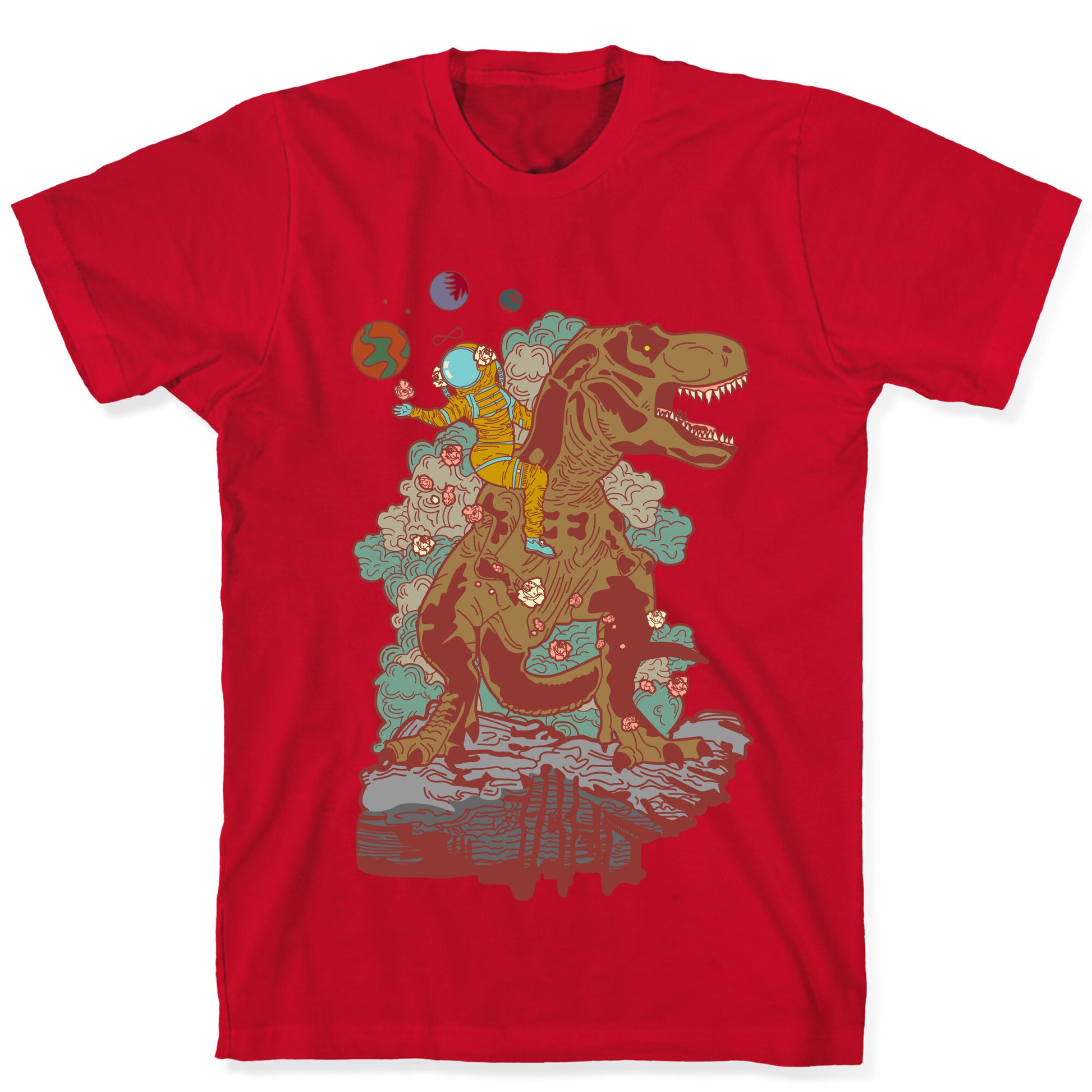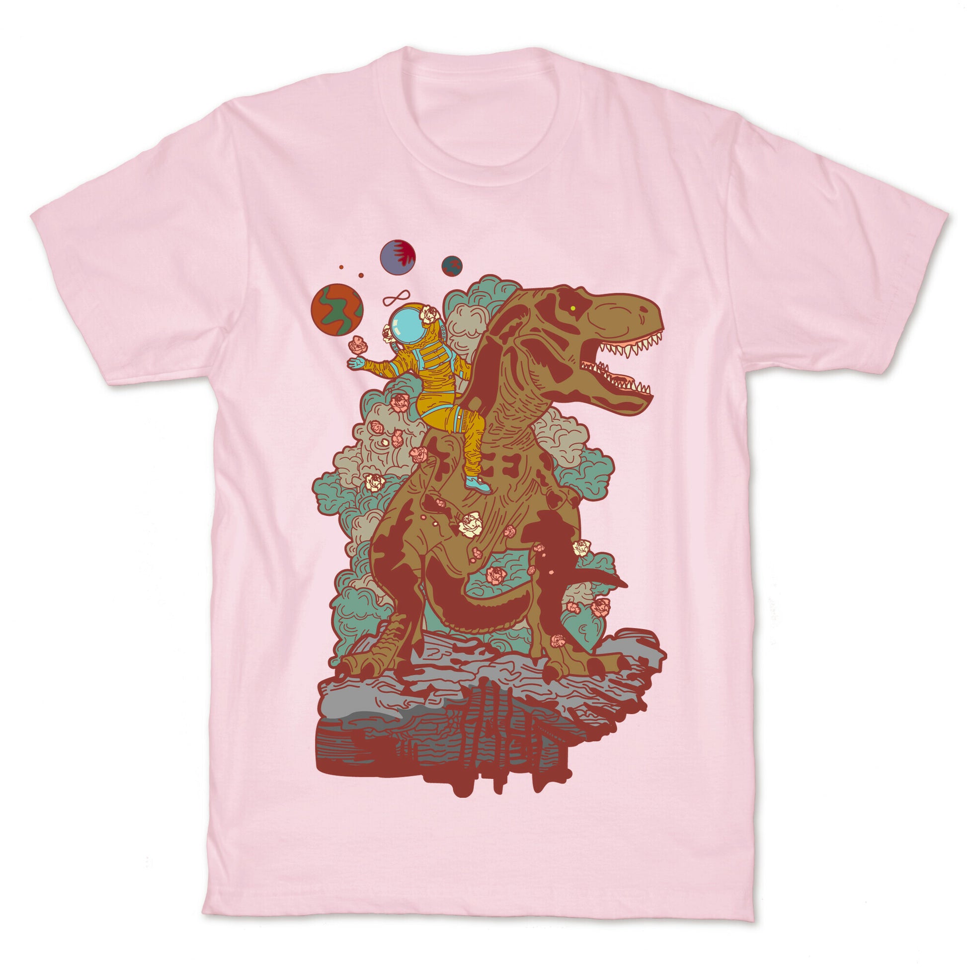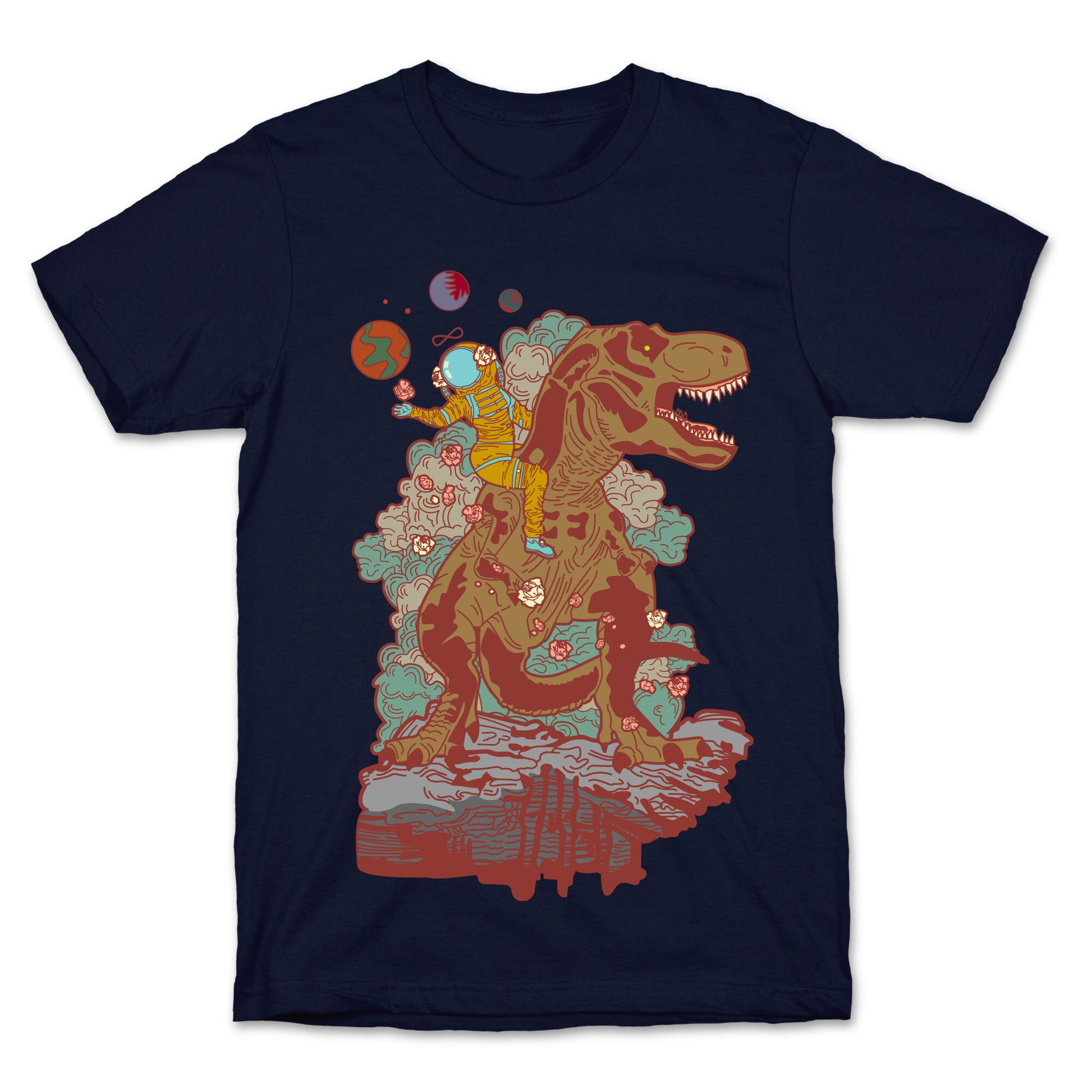 This design is a reimagining of the Strength tarot card. The Strength is numbered either XI or VIII, depending on the deck. It is a Major Arcana and represents self-control, compassion, and comprehension. In this illustration we find a woman far out on a distant planet wearing a space suit while ridding a giant T-rex and scattering roses. Our fitted Unisex Cotton tee is made from an exceedingly soft 100% ring spun cotton. It features a crew neckline with hemmed sleeves and bottom for durability. Preshrunk for your convenience! Printed in the USA. Made with 100% Ring Spun Cotton. Athletic Gray is made up of 90% cotton and 10% polyester. Other heathered colors are made of 52% cotton and 48% polyester.