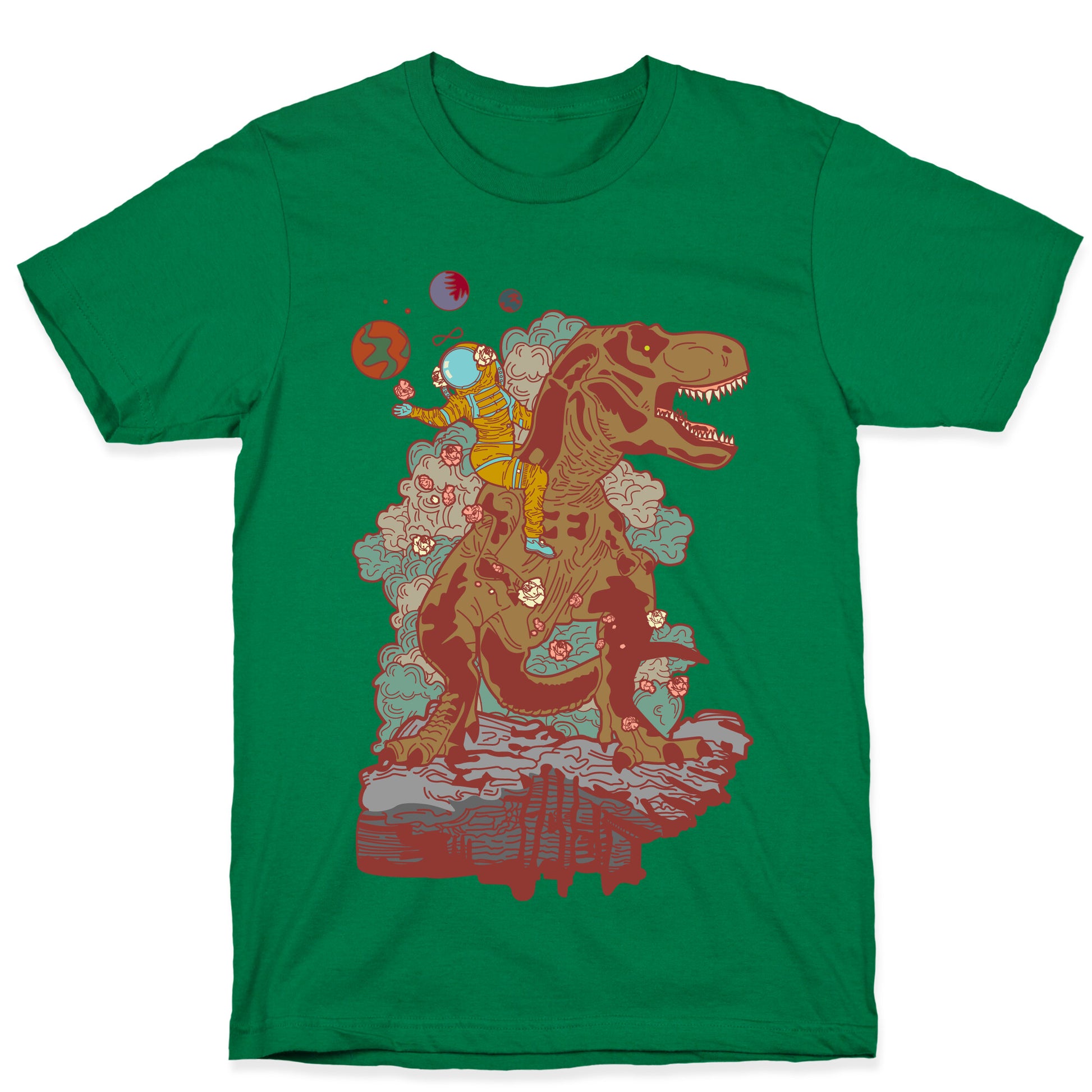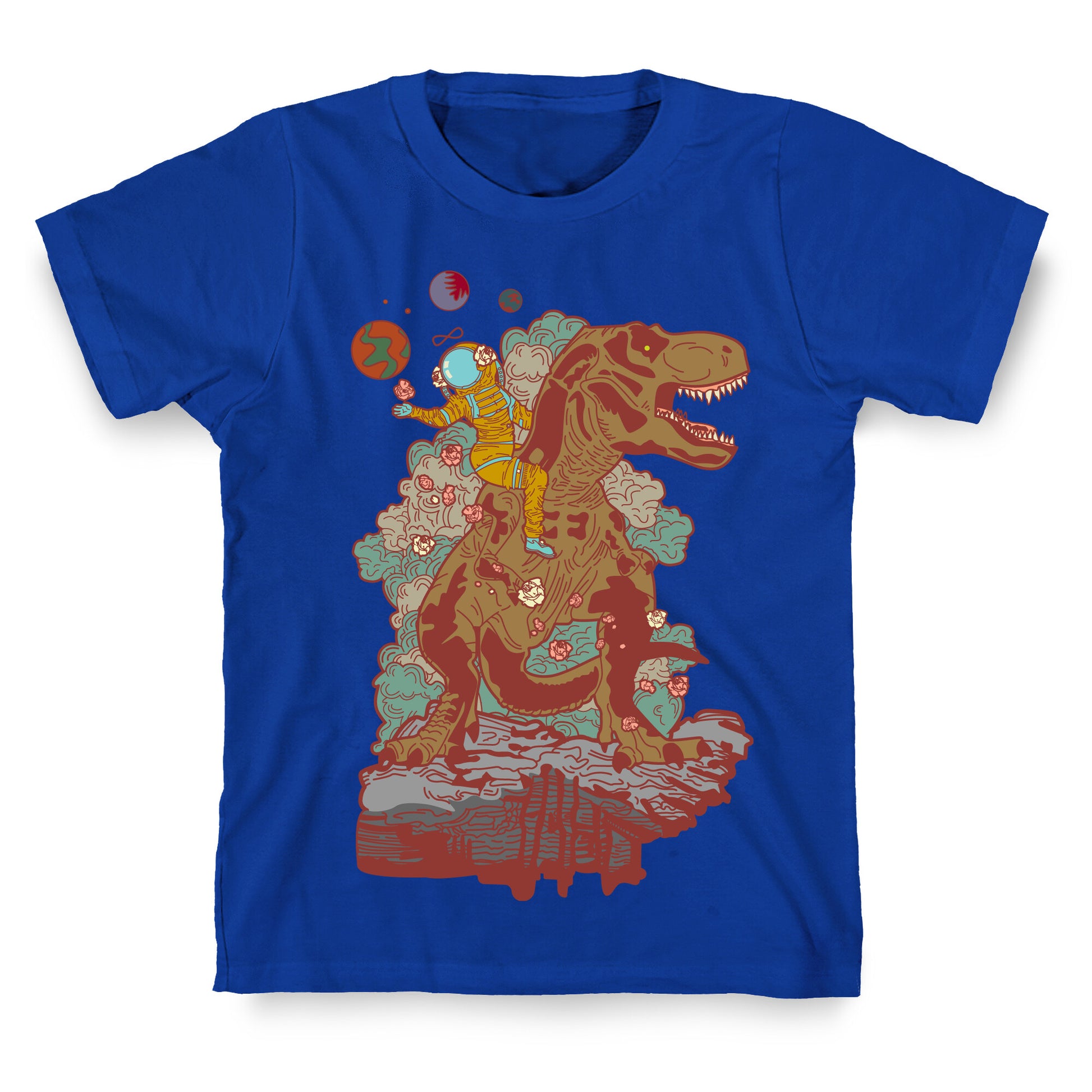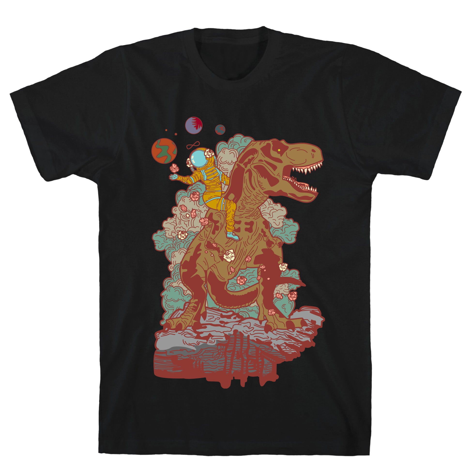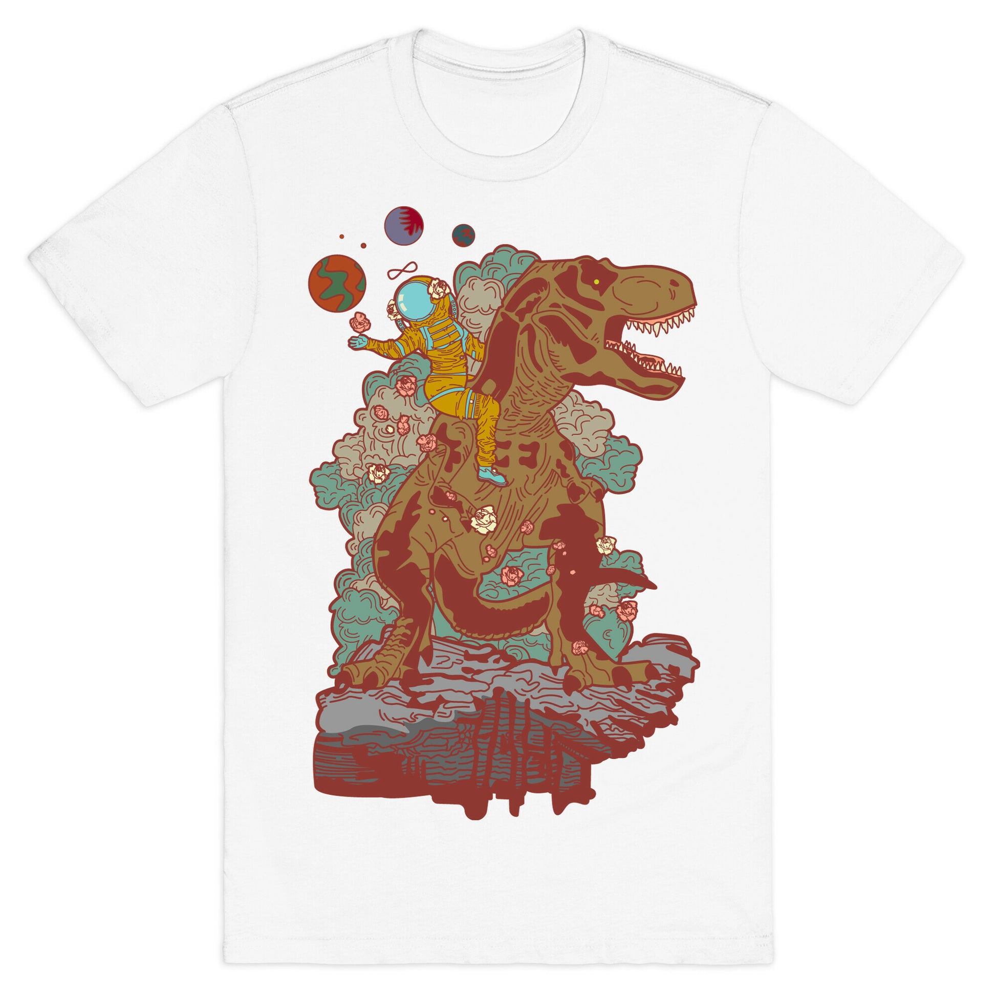 This design is a reimagining of the Strength tarot card. The Strength is numbered either XI or VIII, depending on the deck. It is a Major Arcana and represents self-control, compassion, and comprehension. In this illustration we find a woman far out on a distant planet wearing a space suit while ridding a giant T-rex and scattering roses. Our fitted Unisex Cotton tee is made from an exceedingly soft 100% ring spun cotton. It features a crew neckline with hemmed sleeves and bottom for durability. Preshrunk for your convenience! Printed in the USA. Made with 100% Ring Spun Cotton. Athletic Gray is made up of 90% cotton and 10% polyester. Other heathered colors are made of 52% cotton and 48% polyester.
