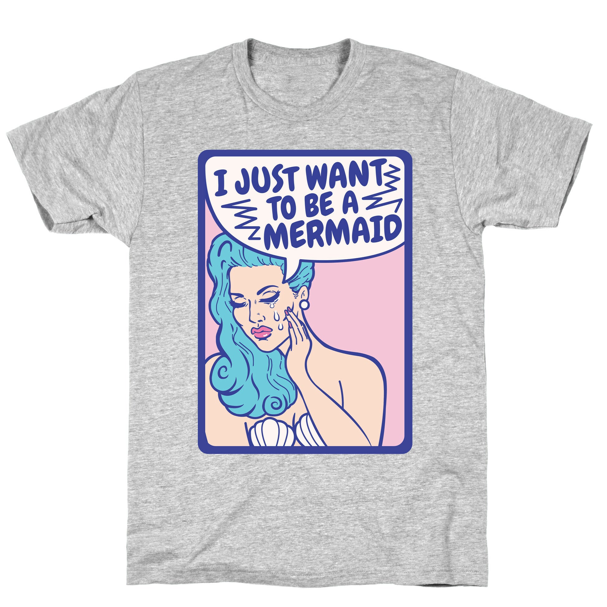 Mermaids don't cry, unless they are humans wishing they were a mermaid! Combine whimsy and art with this funny, comic book, pop art inspired mermaid shirt! Our fitted Unisex Cotton tee is made from an exceedingly soft 100% ring spun cotton. It features a crew neckline with hemmed sleeves and bottom for durability. Preshrunk for your convenience! Printed in the USA. Made with 100% Ring Spun Cotton. Athletic Gray is made up of 90% cotton and 10% polyester. Other heathered colors are made of 52% cotton and 48% polyester.