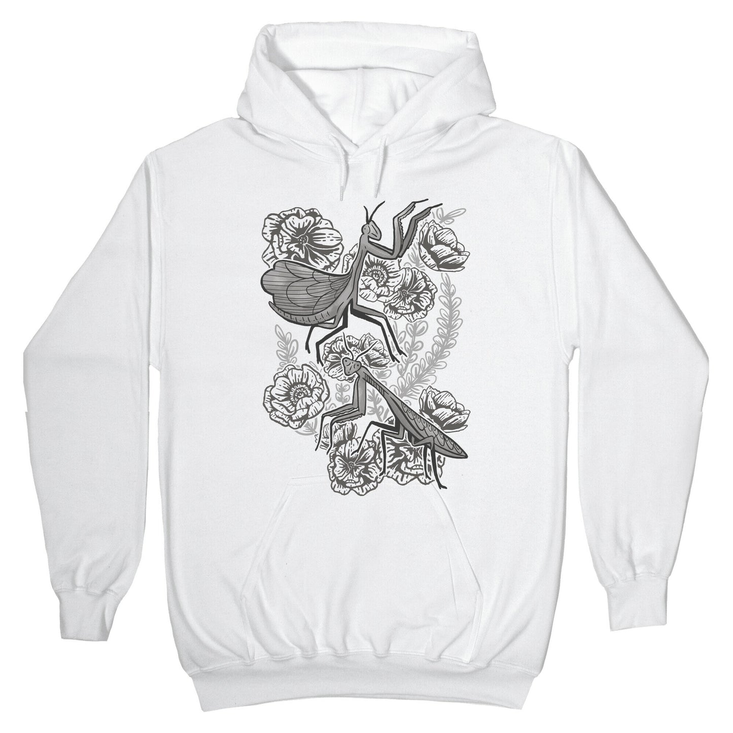 What's better than an insect that will eat it's sexual partners, attack hummingbirds and can be some of the cutest little things around? That's right - it's the praying mantis. This shirt is perfect for the tattoo loving designer who happens to have a love for all things bug. Our Unisex Pullover Hoodie is made from a soft 8-ounce fabric They feature a drawstring hood and front kangaroo pocket. Great for layering! Preshrunk for your convenience! Printed in the USA. Made with 50% Cotton and 50% Polyester.