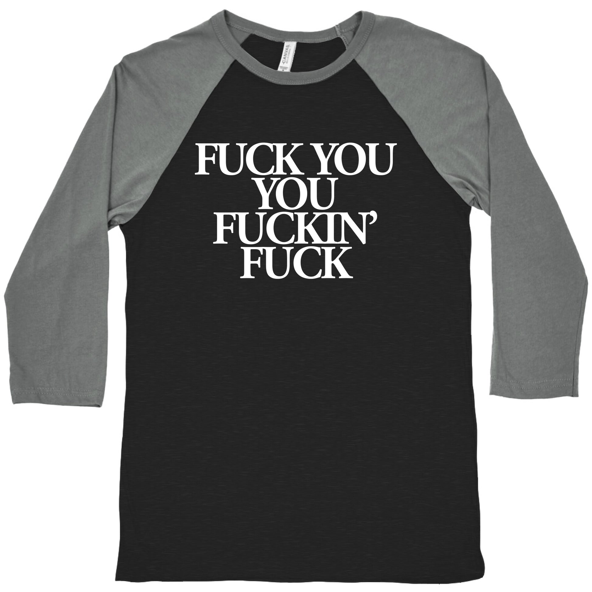 Express your unfiltered thoughts with our bold and badass Fuck You, You Fuckin' Fuck t-shirt. Say goodbye to beating around the bush and let this tee do the talking for you. The perfect shirt for those who aren't afraid to speak their minds and don't give a damn about what others think. Wear it to work, wear it on a date, wear it to the next family gathering - it's guaranteed to make a statement. Whether you're feeling angry, frustrated, or just plain savage, our Fuck You, You Fuckin' Fuck tee has got your back. So don't hold back, let it all out and embrace your inner rebel with this badass t-shirt. Order yours now and unleash your raw, unfiltered self onto the world. Our exceedingly soft and relaxed fit Tri-Blend Baseball Tee features a three-quarter length sleeve, crew neck, fun contrasting color sleeves and neck trim. Preshrunk for your convenience! Printed in the USA. Made with 50% Polyester, 25% Cotton and 25% Rayon
