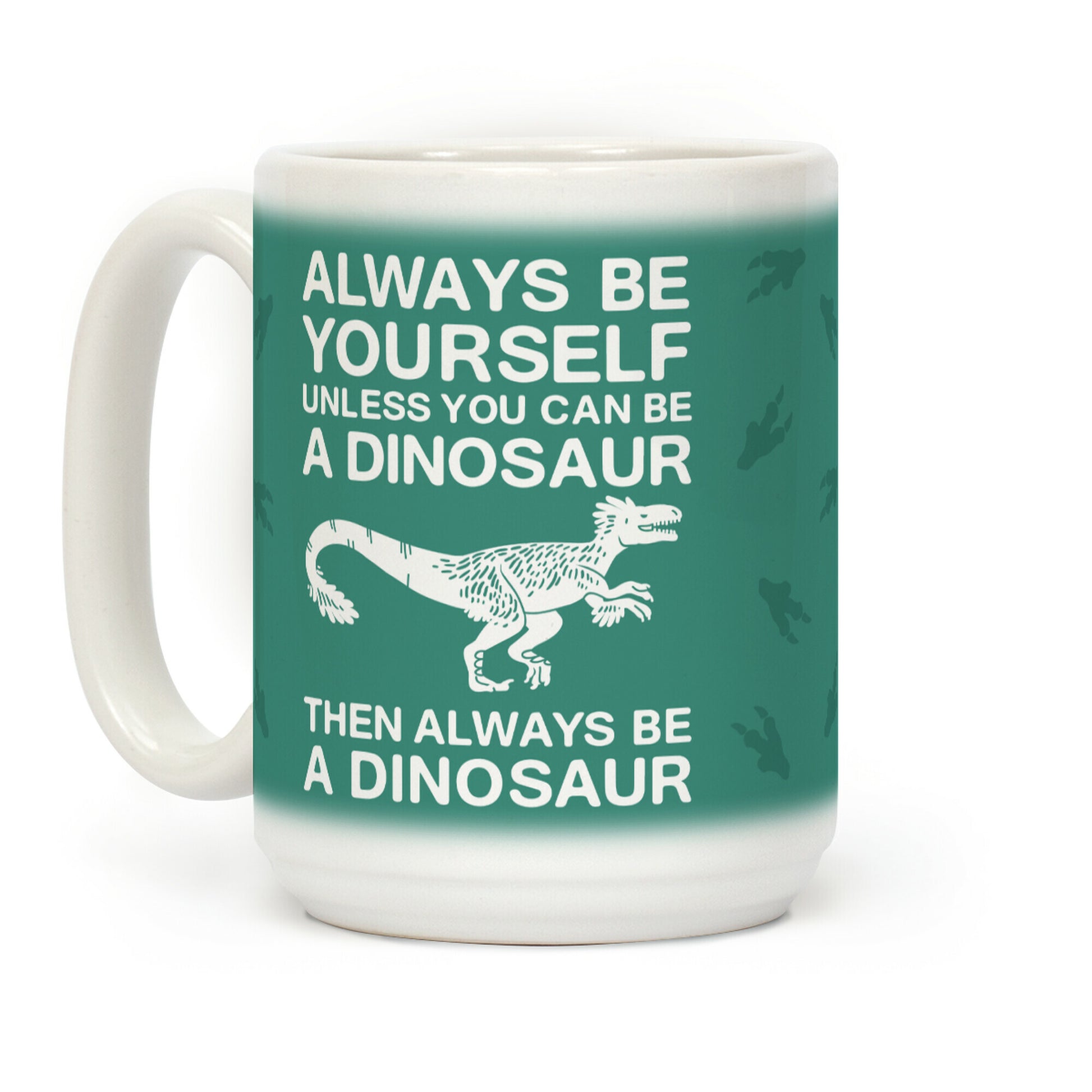 Being yourself is good, but being a dinosaur is better. All claws, all teeth, no problems at all! Well, except maybe food. Aspire high, aspire to be your best self, but as a dinosaur. Be inspired to love yourself and be a dinosaur with this great inspirational mug design. Our Mug features large handles for easy gripping and a wrap-around print. These heavy-duty Mugs are both dishwasher and microwave safe. Printed in the USA