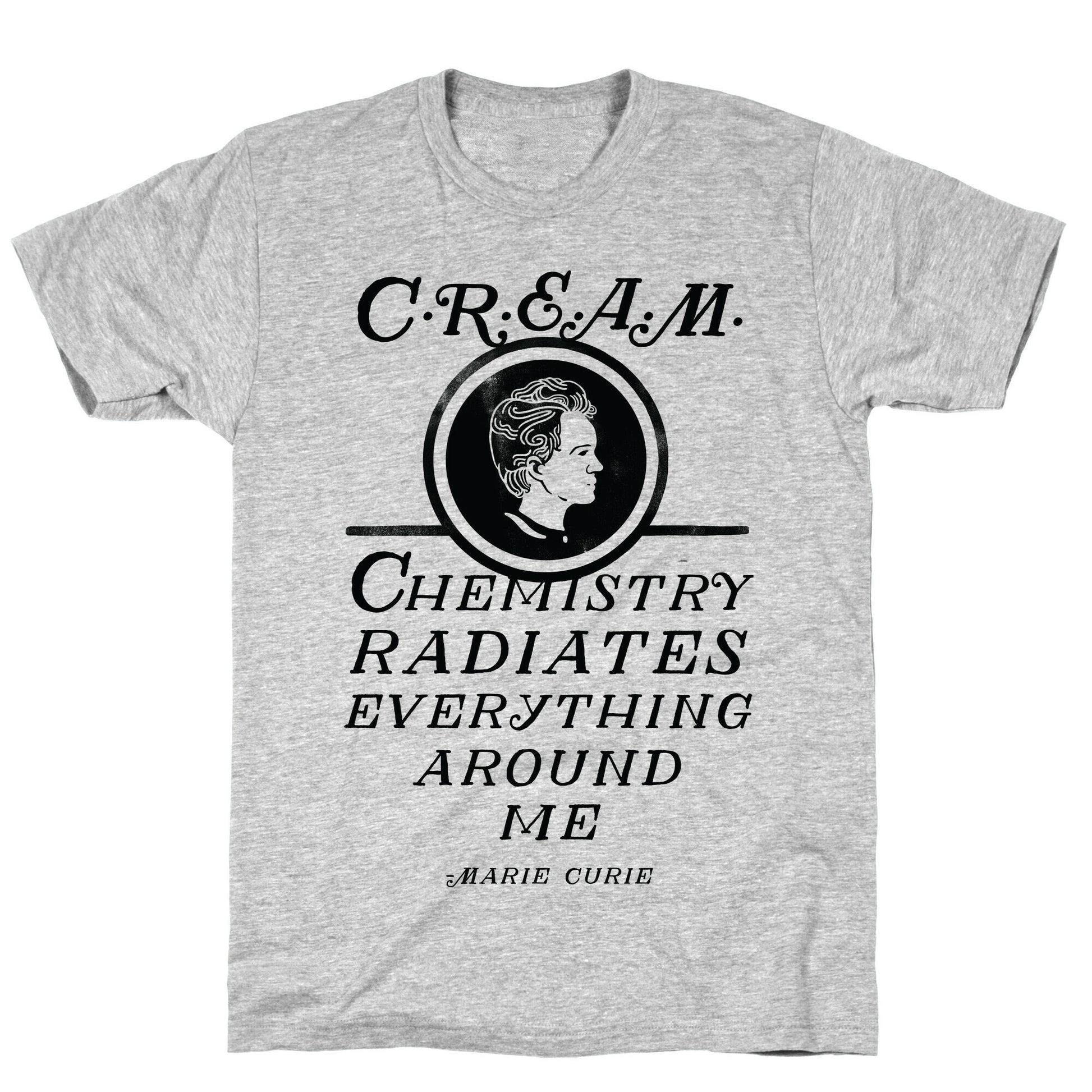 In the wise words of Marie Curie, Chemistry Radiates Everything Around Me, CREAM. Wear this shirt to rep your love for everyone's favorite and most lyrical chemist, lest history forget her lucrative rap career. A great gift for discerning nerds and chemists. Our fitted Unisex Cotton tee is made from an exceedingly soft 100% ring spun cotton. It features a crew neckline with hemmed sleeves and bottom for durability. Preshrunk for your convenience! Printed in the USA. Made with 100% Ring Spun Cotton. Athletic Gray is made up of 90% cotton and 10% polyester. Other heathered colors are made of 52% cotton and 48% polyester.