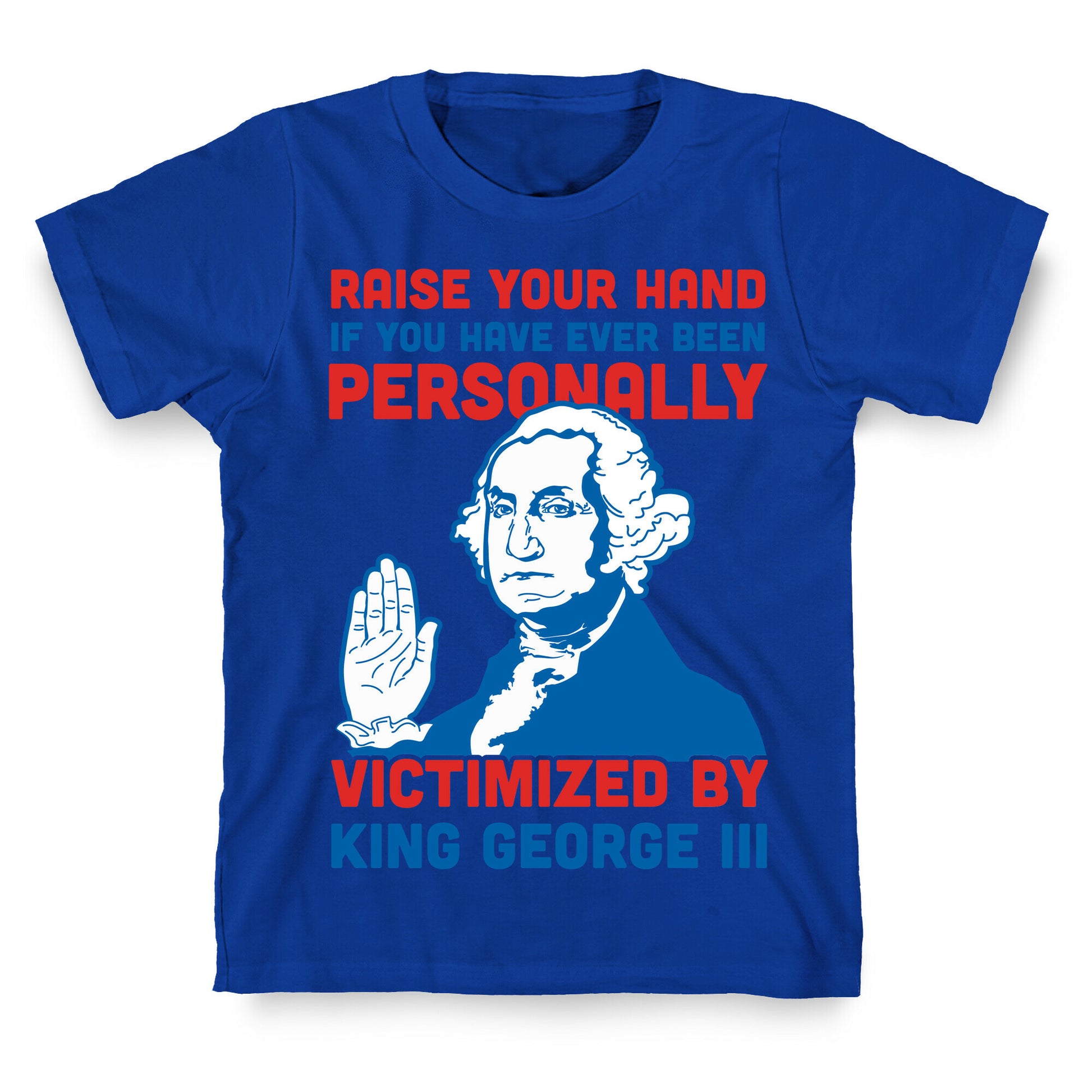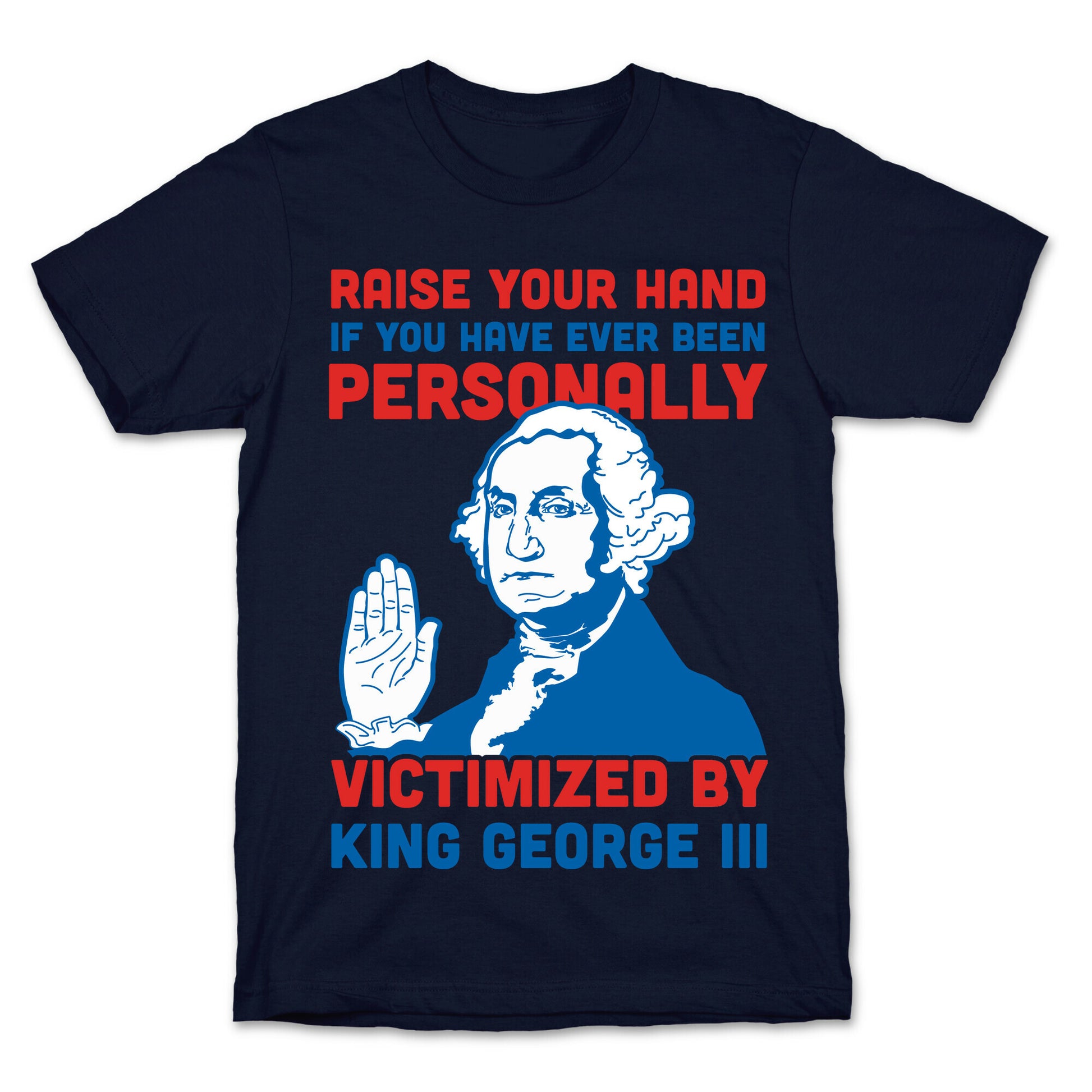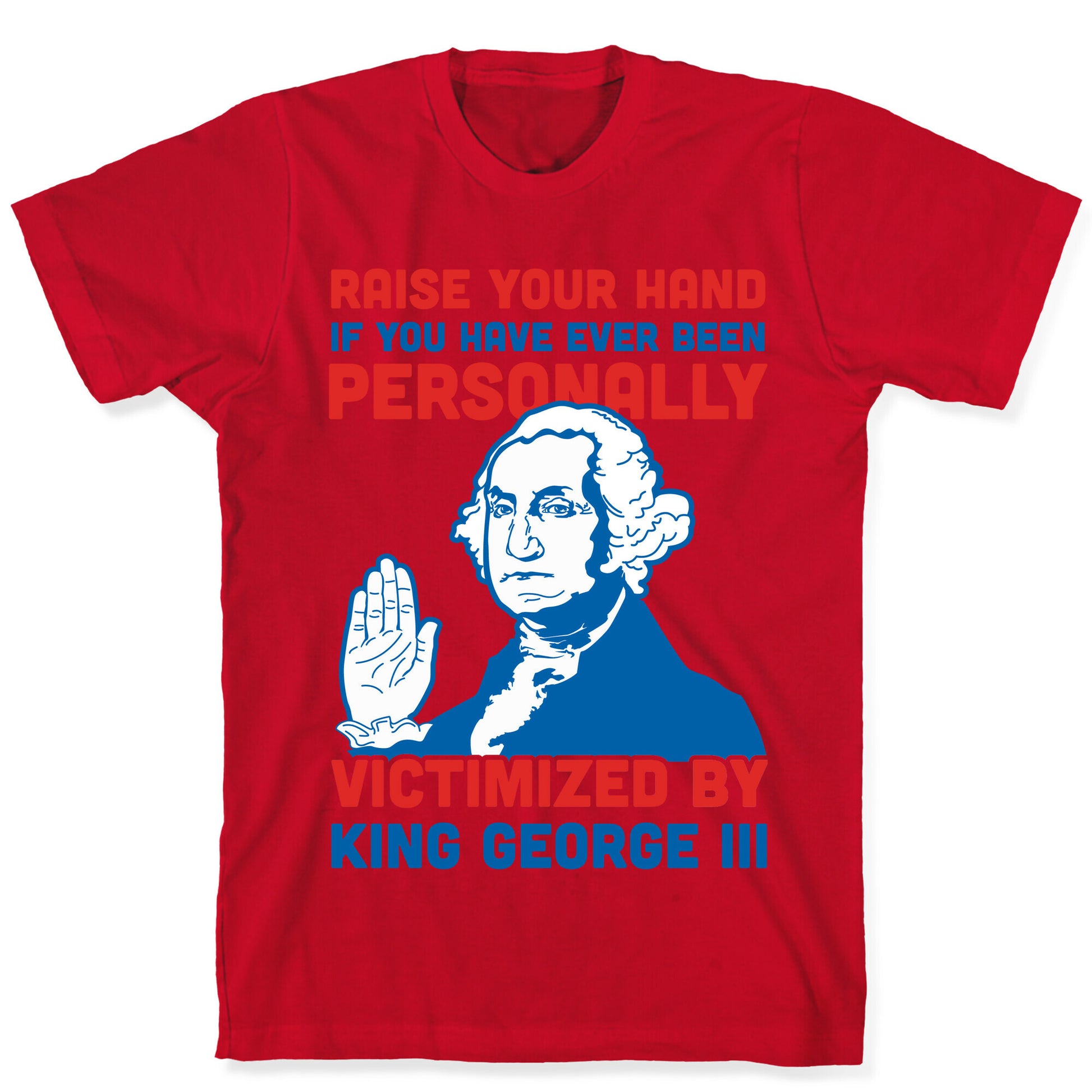 Mean Girls meme's and American history collide in this historical humor design. This red white and blue shirt features an illustration of George Washington and the phase "Raise your hand if you have ever been personally victimized by King George III."