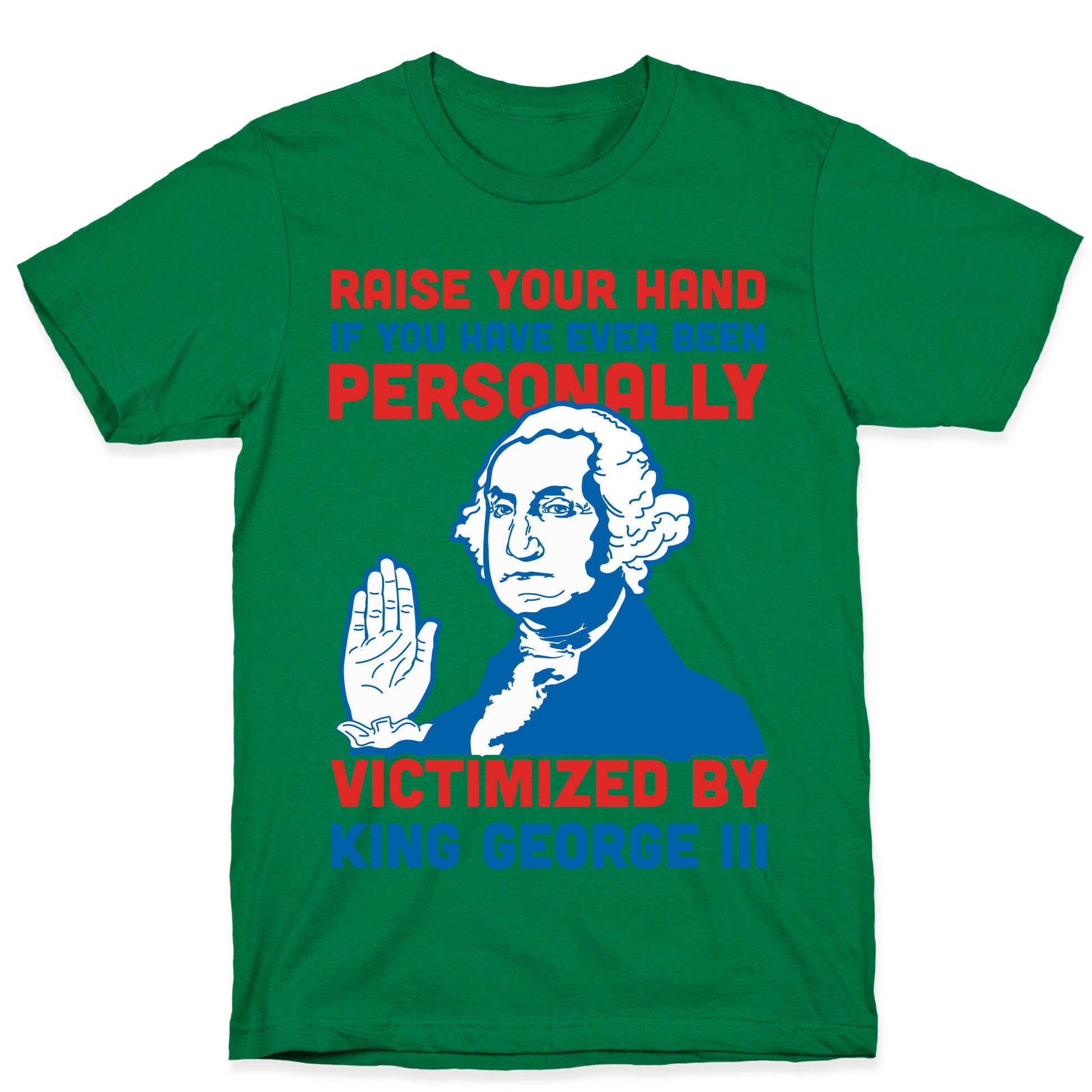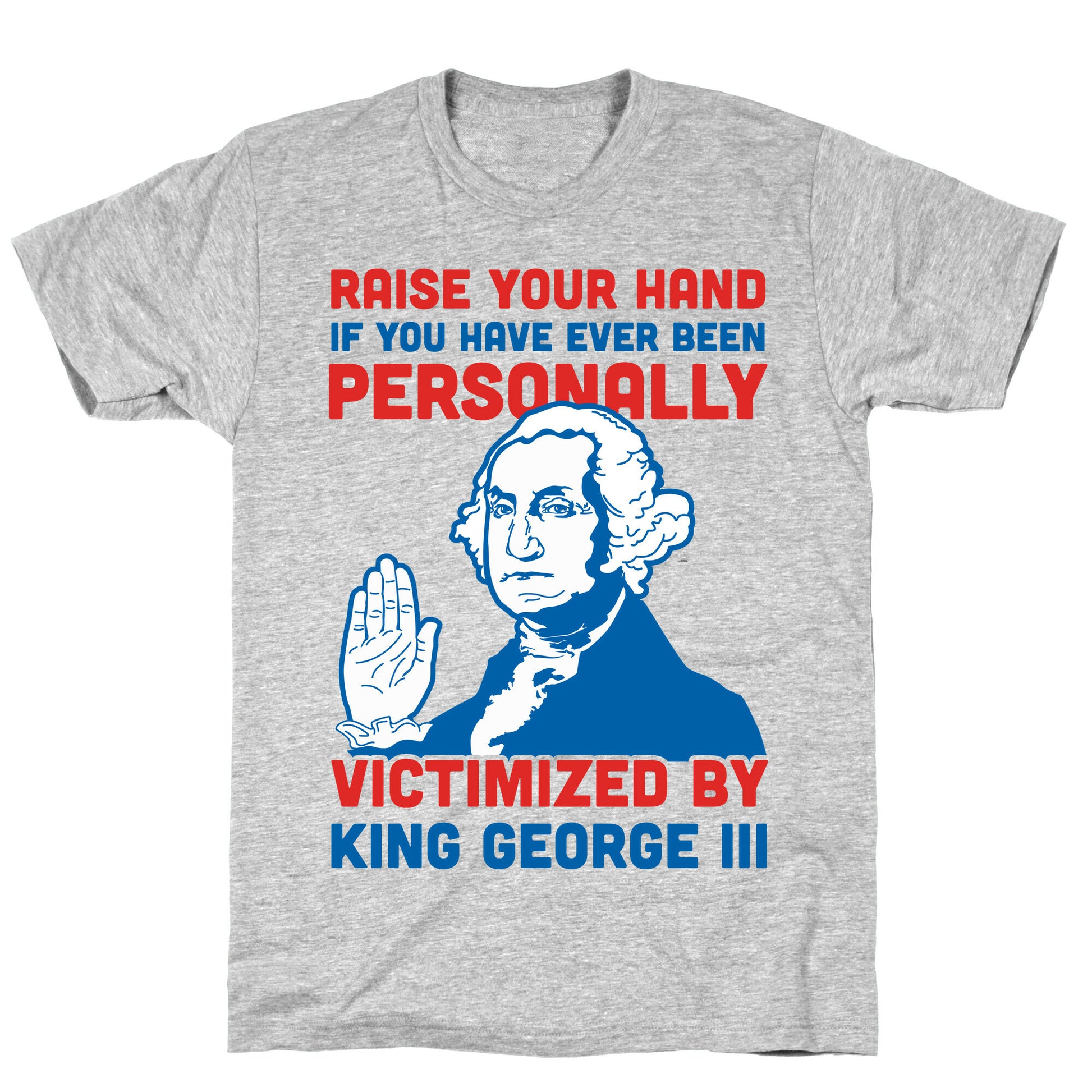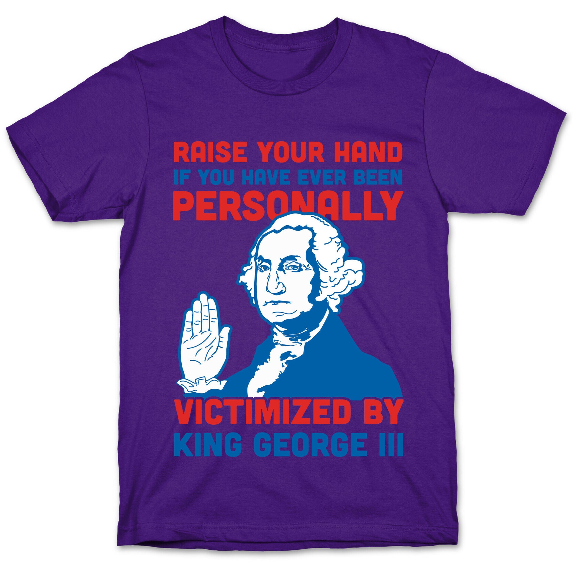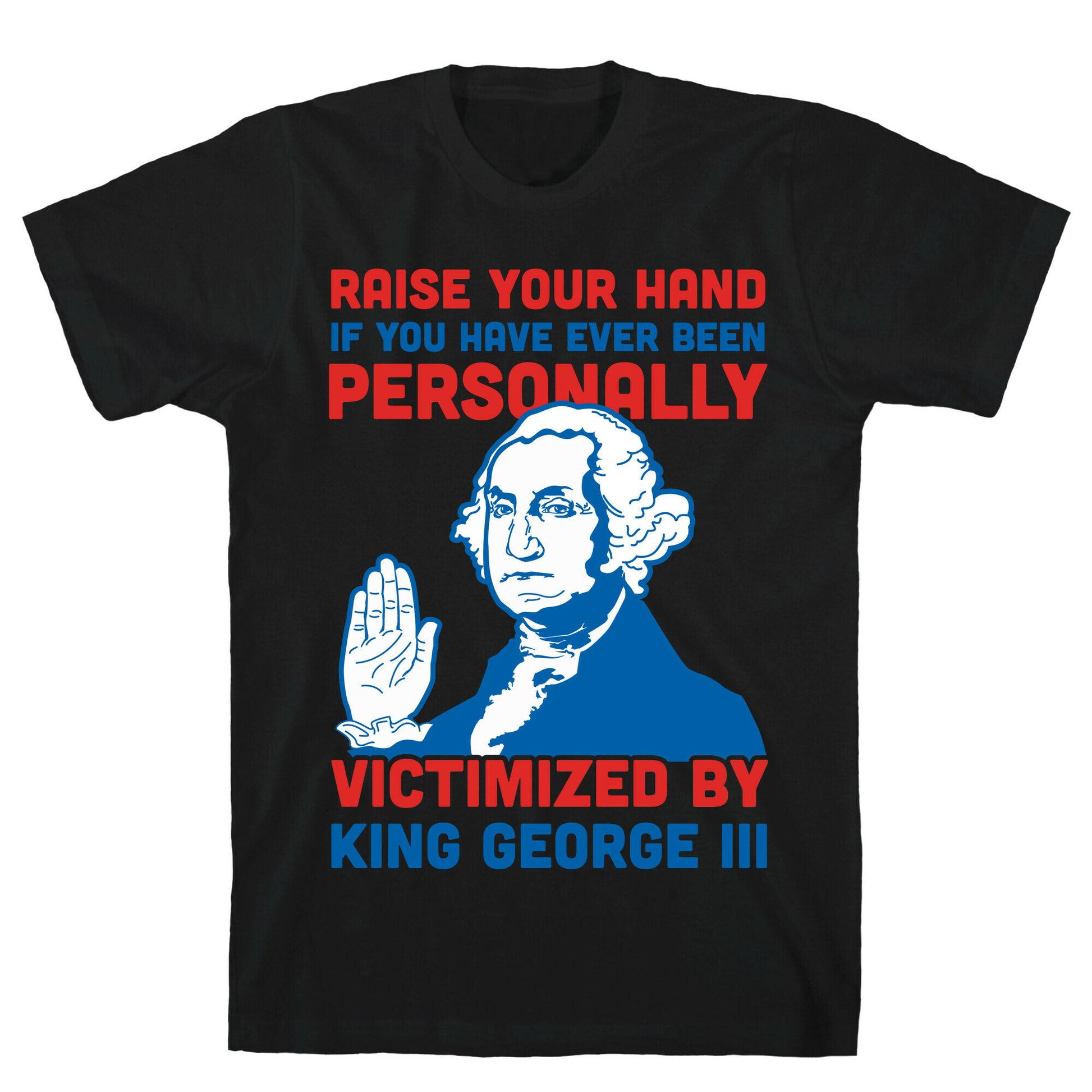 Mean Girls meme's and American history collide in this historical humor design. This red white and blue shirt features an illustration of George Washington and the phase "Raise your hand if you have ever been personally victimized by King George III."