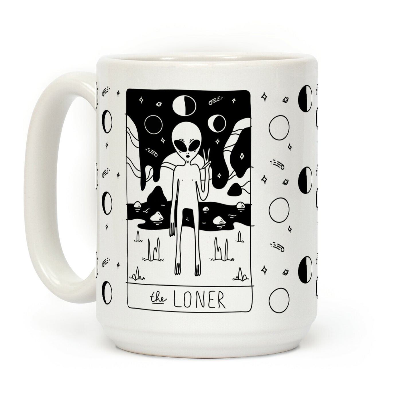 Show off your love of the spiritual world with this tarot card inspired, alien believer's, science fiction, astrological, introvert's coffee mug! Show the world that you are a loner and you are proud! Our Mug features large handles for easy gripping and a wrap-around print. These heavy-duty Mugs are both dishwasher and microwave safe. Printed in the USA.