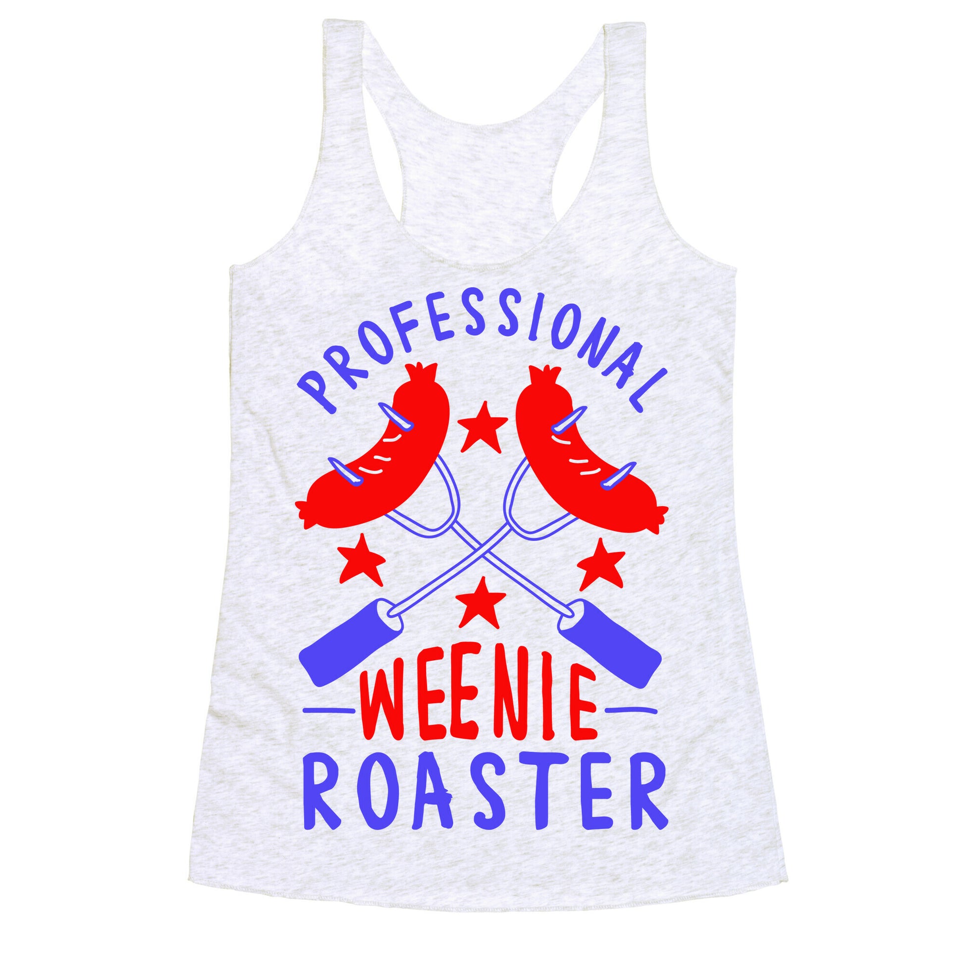 Let your patriotic country pride show with this red white and blue weenie roast shirt. This 4th of July shirt features an illustration of hotdogs on skewers and the phrase "Professional Weenie Roaster." Hot dogs always taste better cooked at campfire.Our super comfortable Women’s Raw Edge Racerback features a soft tri-blend, unhemmed fabric, with a fashionable bell-like shape for the bottom. Preshrunk for your convenience! Printed in the USA. Made with 50% Polyester 25% Ring Spun Cotton, and 25% Rayon.