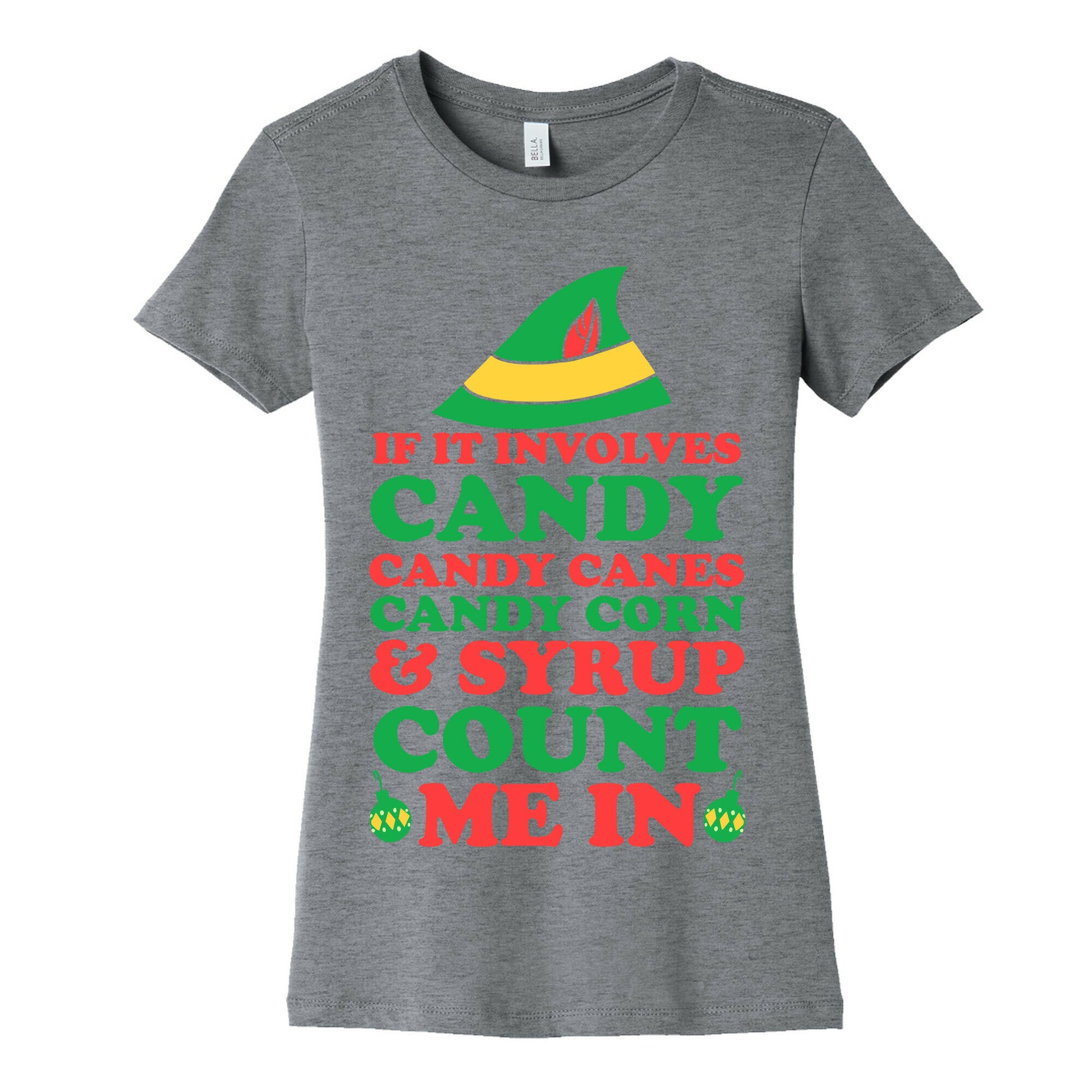 If it involves candy, candy canes, candy corns and syrup, count me in! Whether it's Christmas in July or just Christmas, this funny Christmas shirt is sure to make you laugh. Because we all know elves have a distinct diet of mostly candy and sugar, and if you've got true holiday cheer, you're pretty much an elf anyway.Our slim fit Women’s Cotton Tees, are made with exceedingly soft 100% cotton. They feature a relaxed neckline, and the sleeves and bottom, are hemmed for durability. Preshrunk for your convenience! Printed in the USA. Made with 100% Cotton. Colors such as gray, is made up of 90% cotton and 10% polyester, and deep pink is made up of 50% cotton and 50% polyester.