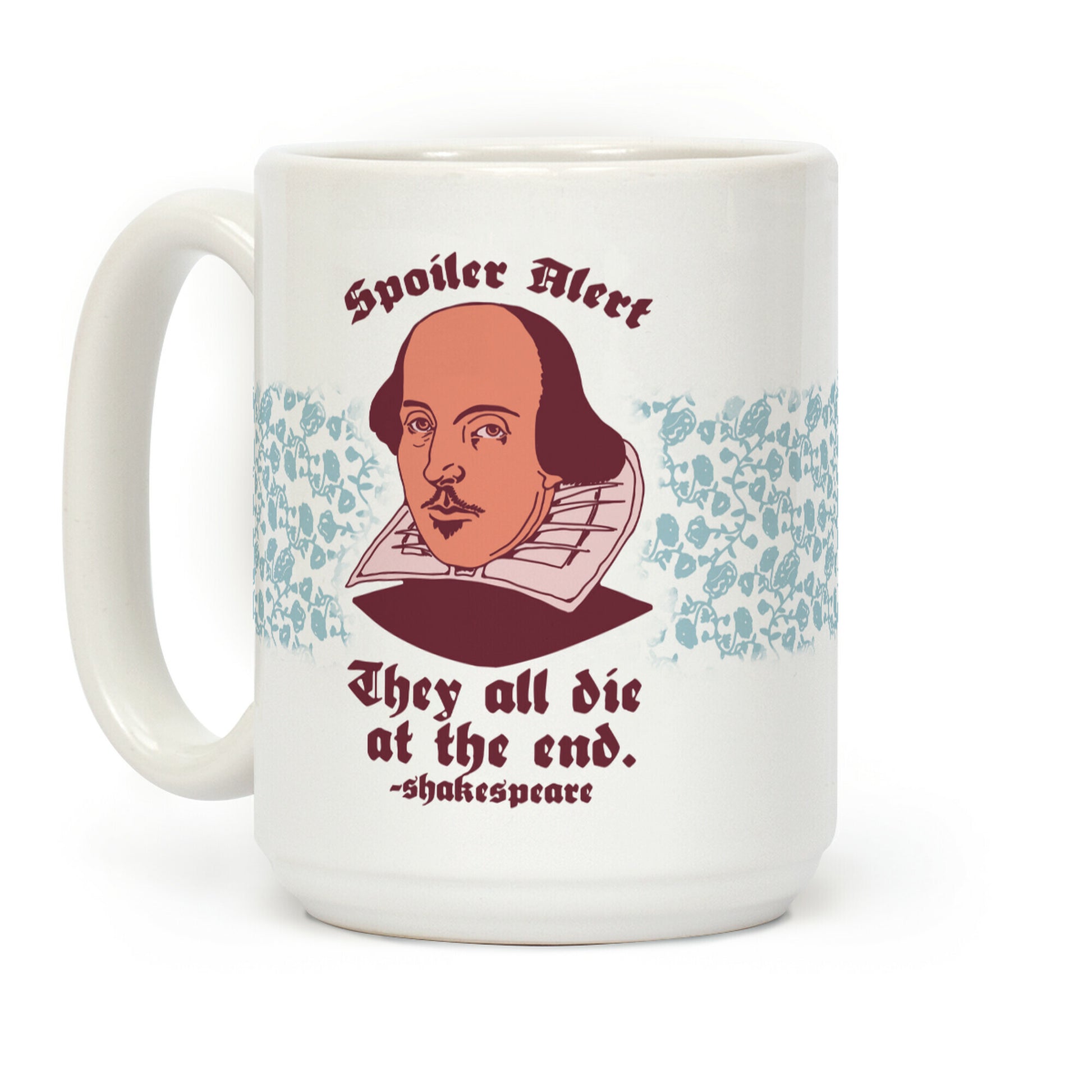 Don't say I didn't warn you. Get some laughs with this funny Shakespeare misquote saying "Spoiler alert! They all die in the end!" This funny literary mug is perfect for writers, english majors, fans of the works of Shakespeare like Romeo & Juliet, Julius Caesar, Othello, Hamlet, Macbeth, Anthony & Cleopatra, and King Lear, and people who love to spoil things for other people and crying about the death of fictional characters. Our Mug features large handles for easy gripping and a wrap-around print. These heavy-duty Mugs are both dishwasher and microwave safe. Printed in the USA.
