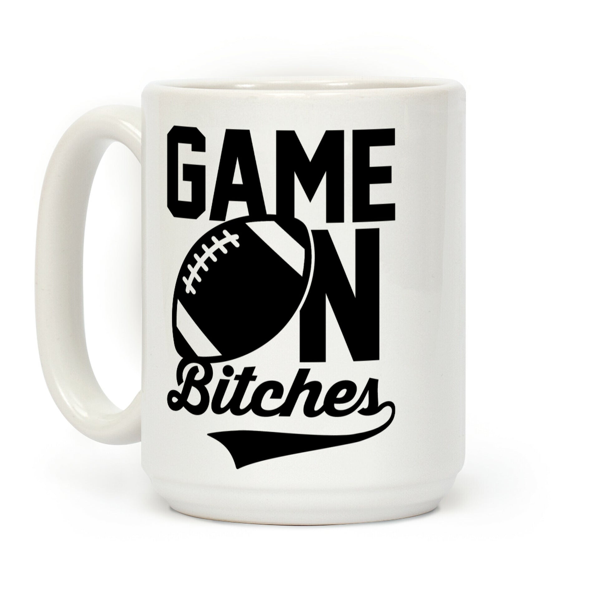 This cute sporty football coffee mug features the words "game on bitches" and is perfect for people who love sports, tailgating, going to games, cheering on your team, playing sports, drinking, partying, grilling, and having a blast on game day with your team mates!