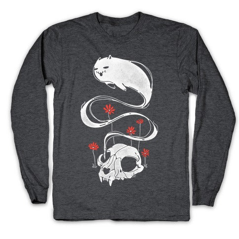 Looking for a t-shirt that combines your love for cats and ghoulish things? Look no further than the Cat Ghost t-shirt! This spooky and adorable t-shirt features a little ghostly feline emerging from a cat skull, surrounded by crimson flowers. It's perfect for Halloween parties, or any time you want to show off your love for cute little kitties and the eerie unknown. We can't guarantee that wearing this shirt will protect you from spooky ghost encounters, but we do know that you'll look amazing while wearing it. So why wait? Show the world your love for cats and the macabre with the Cat Ghost t-shirt!Our Unisex Long Sleeve Tee is made from a soft 100% cotton jersey knit. It features a crew neckline with ribbed cuffs and hemmed bottom for durability. Preshrunk for your convenience! Printed in the USA. Athletic Gray is made up of 90% cotton and 10% polyester.
