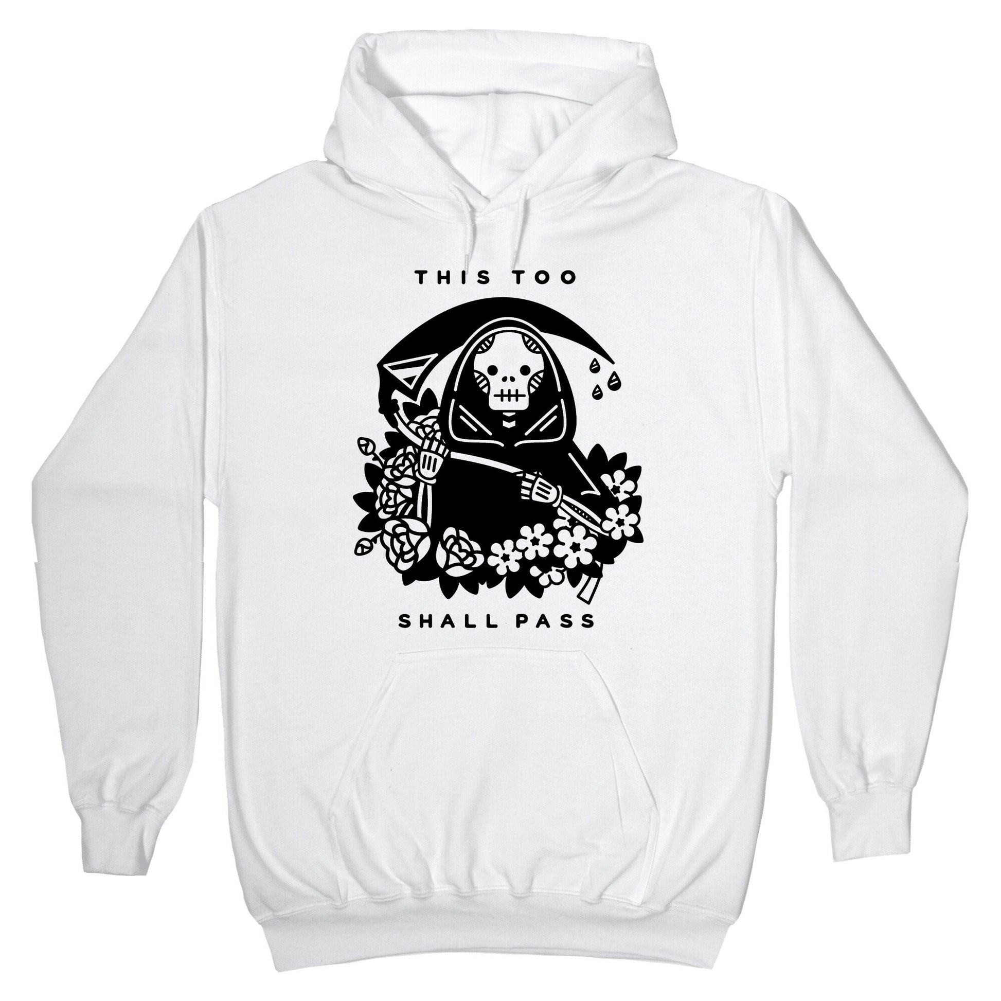 Don't fear the reaper with this Grim Reaper t-shirt. This graphic tee features an illustration of The Grim Reaper holing it's Death Scythe surrounded by flowers and the phrase "This Too Shall Pass." Our Unisex Pullover Hoodie is made from a soft 8-ounce fabric They feature a drawstring hood and front kangaroo pocket. Great for layering! Preshrunk for your convenience! Printed in the USA. Made with 50% Cotton and 50% Polyester.